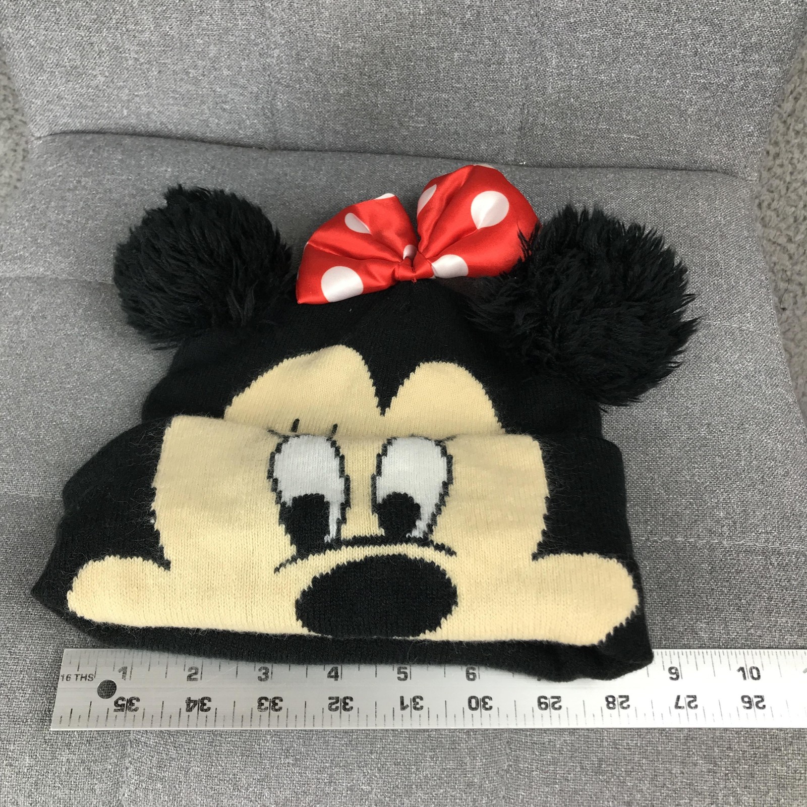 как выглядит Disney Minnie Mouse Hat Beanie One Size Black Red Polka Dot Bow Knit Girls фото