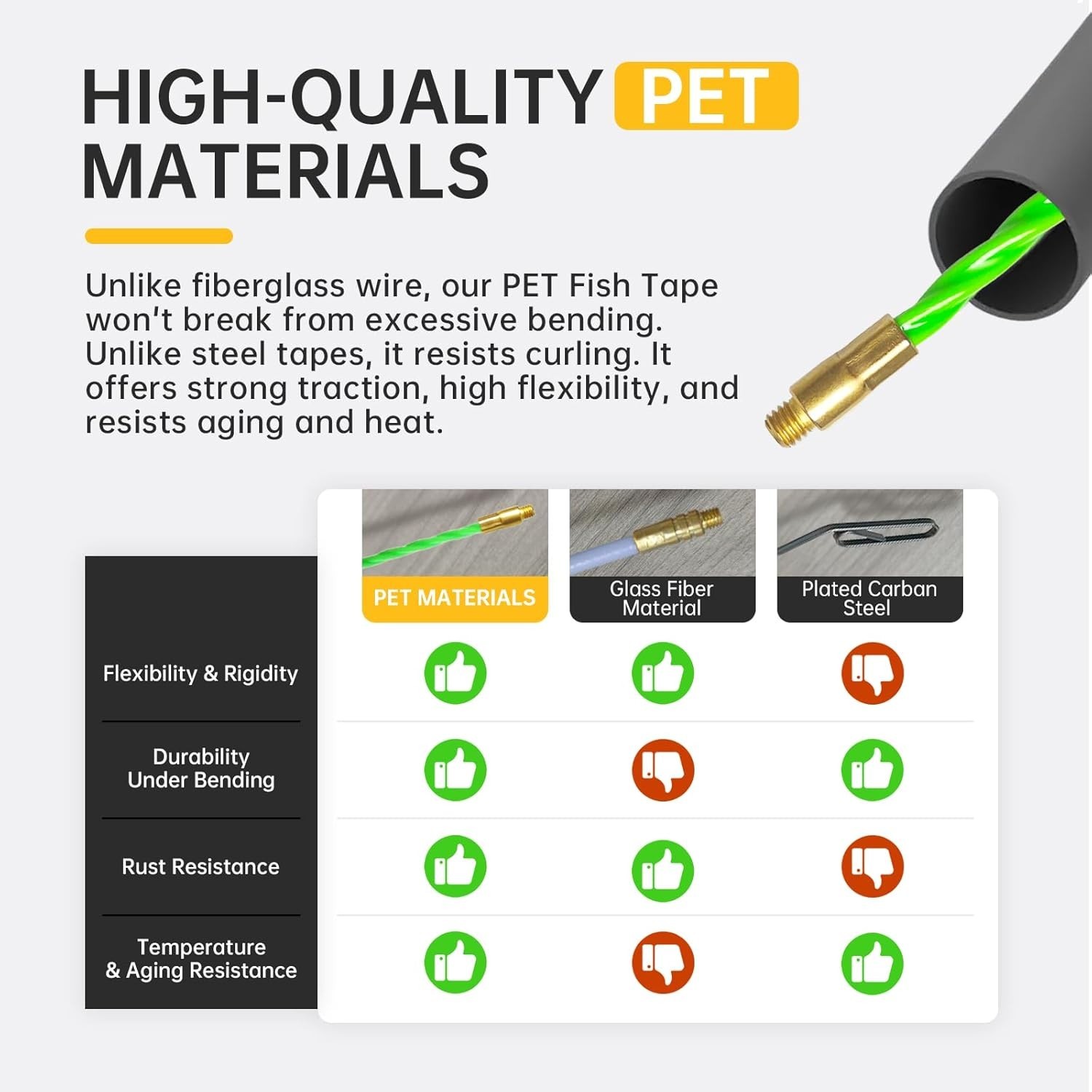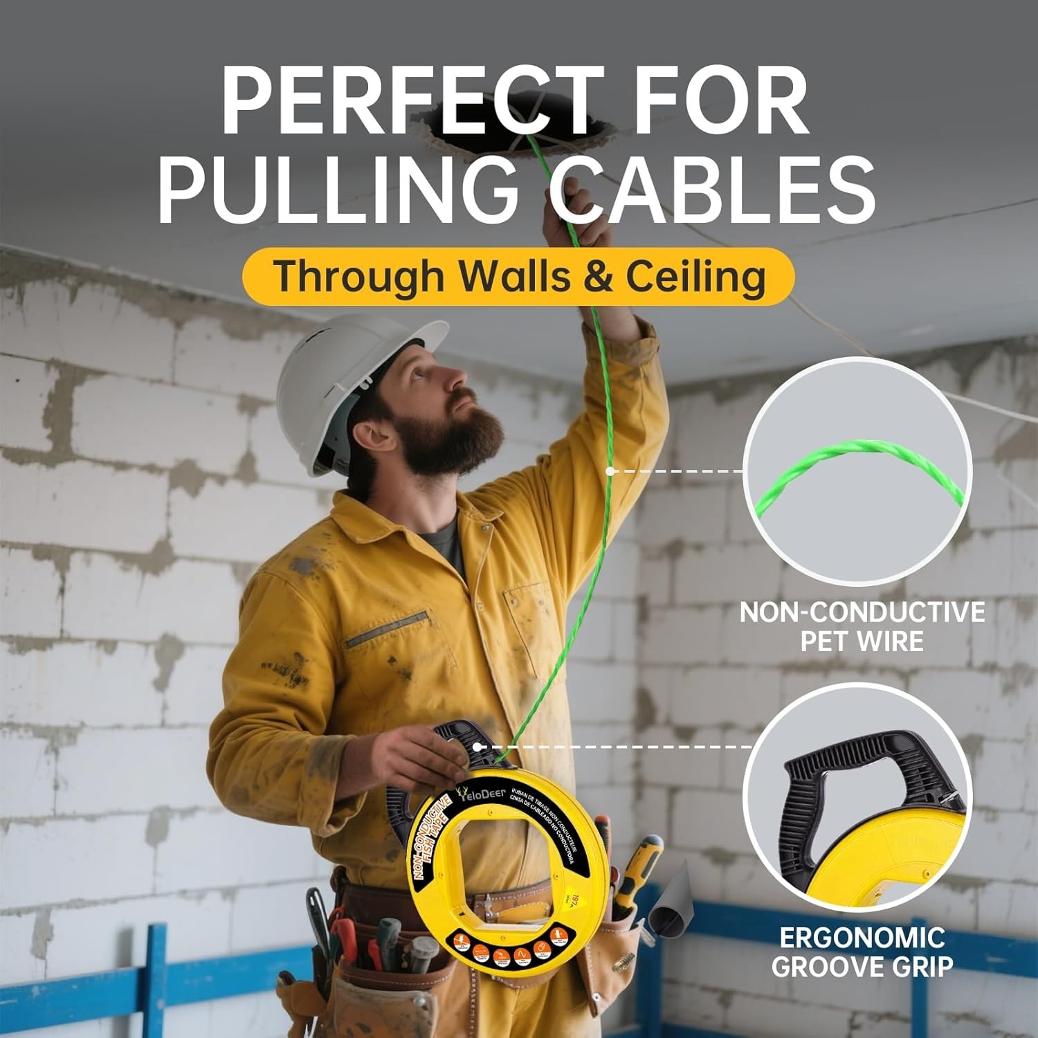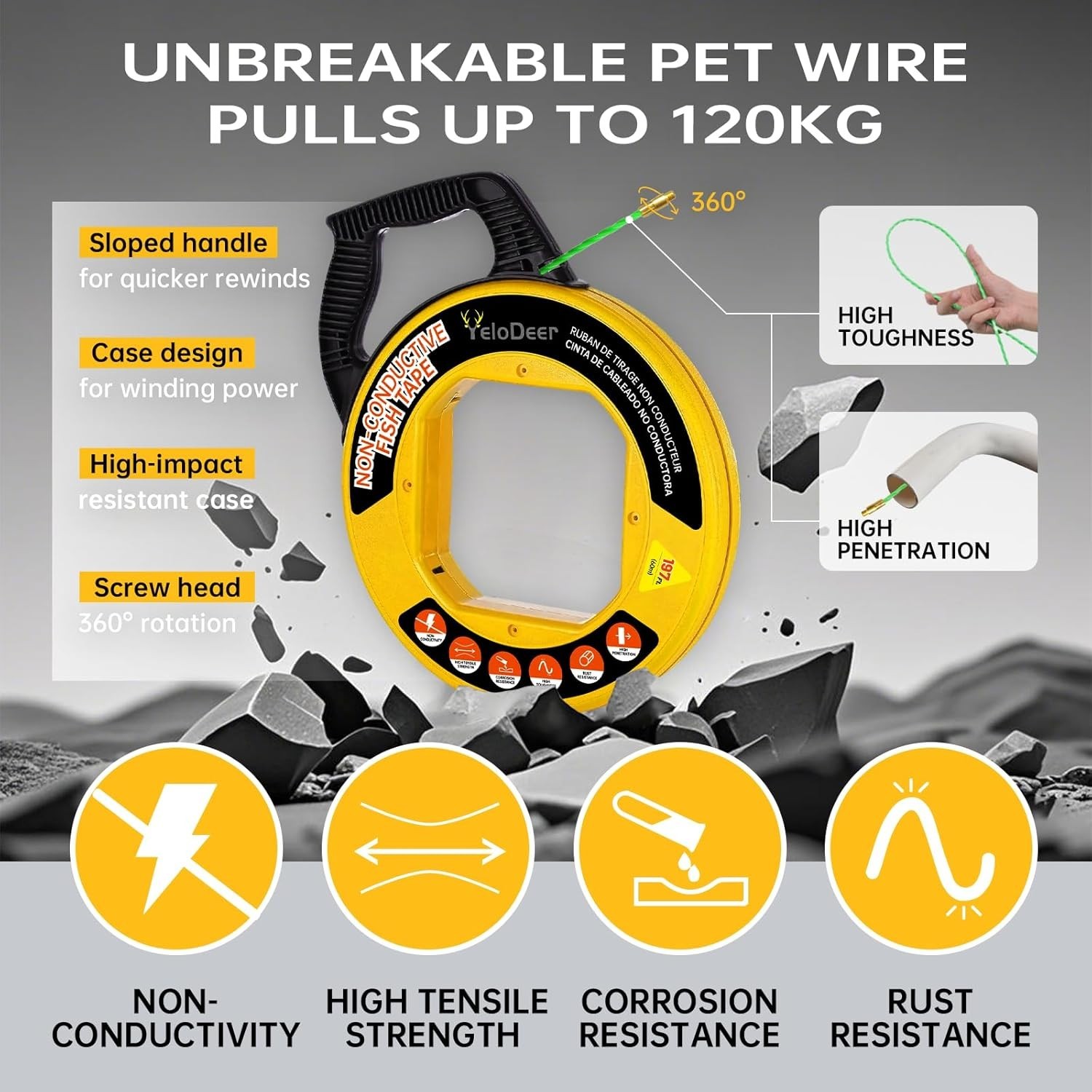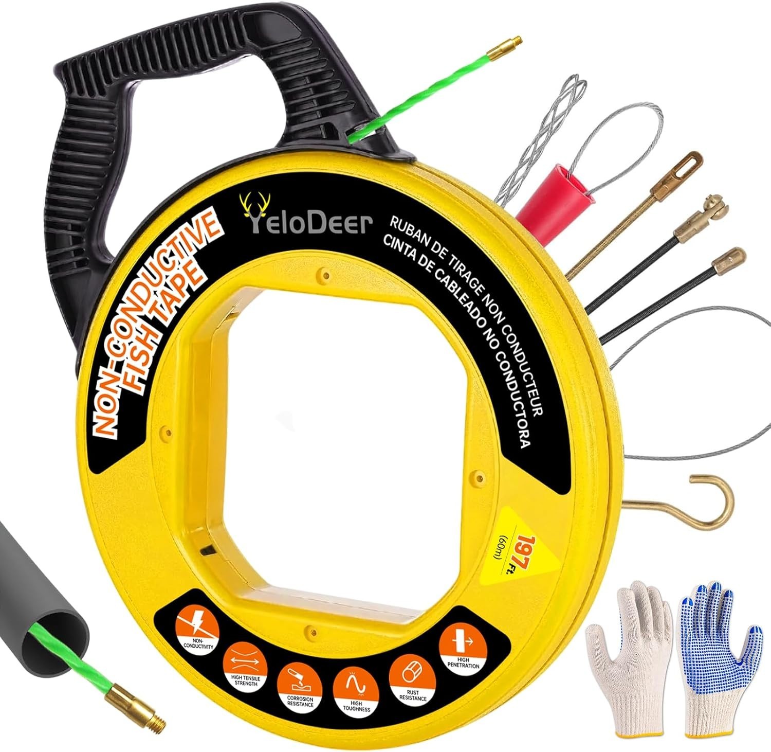 Fish Tape Wire Puller 197FT x 4.5mm with Gloves 7 Adapters for Conduit