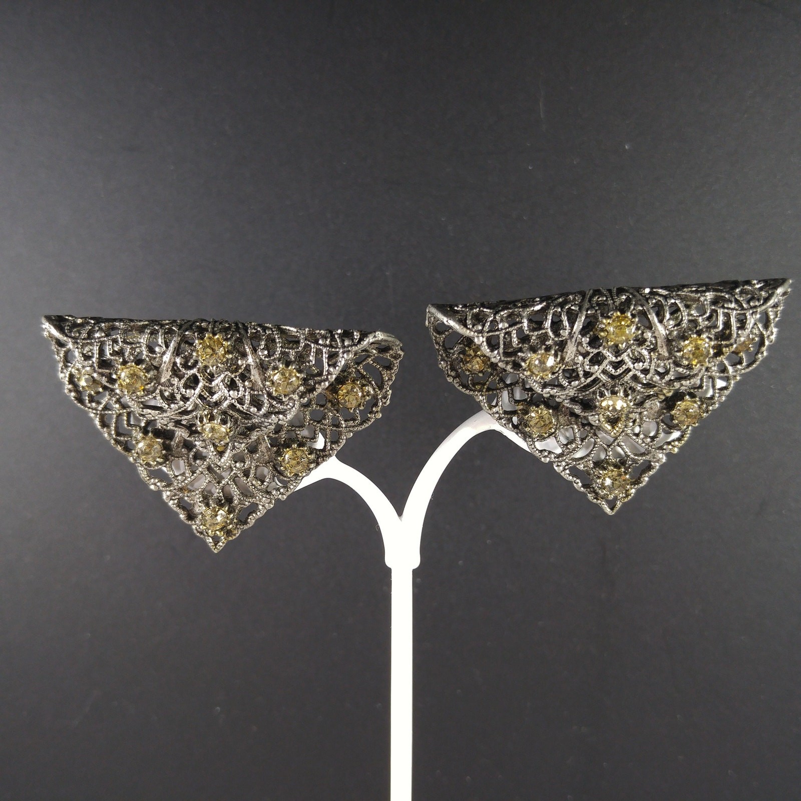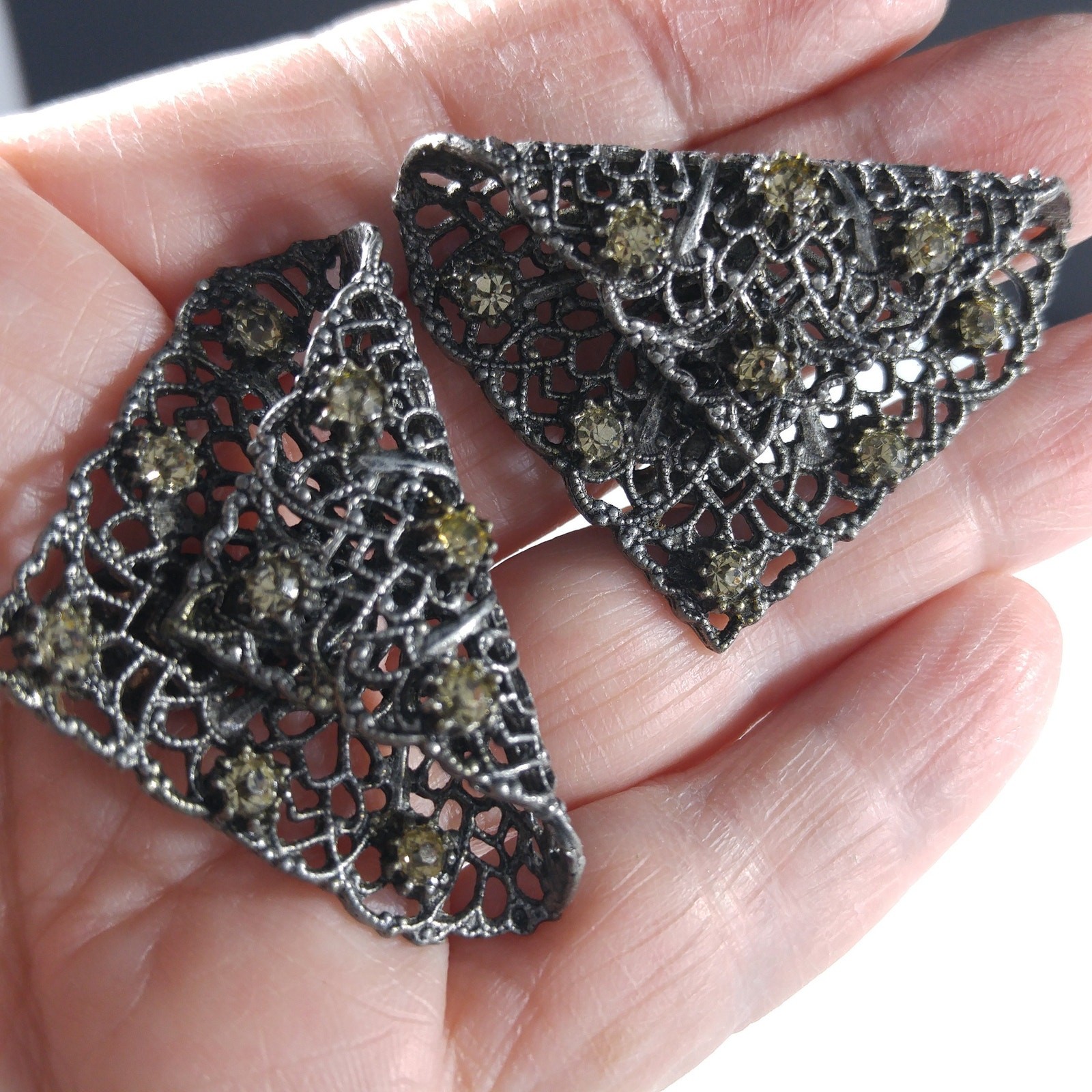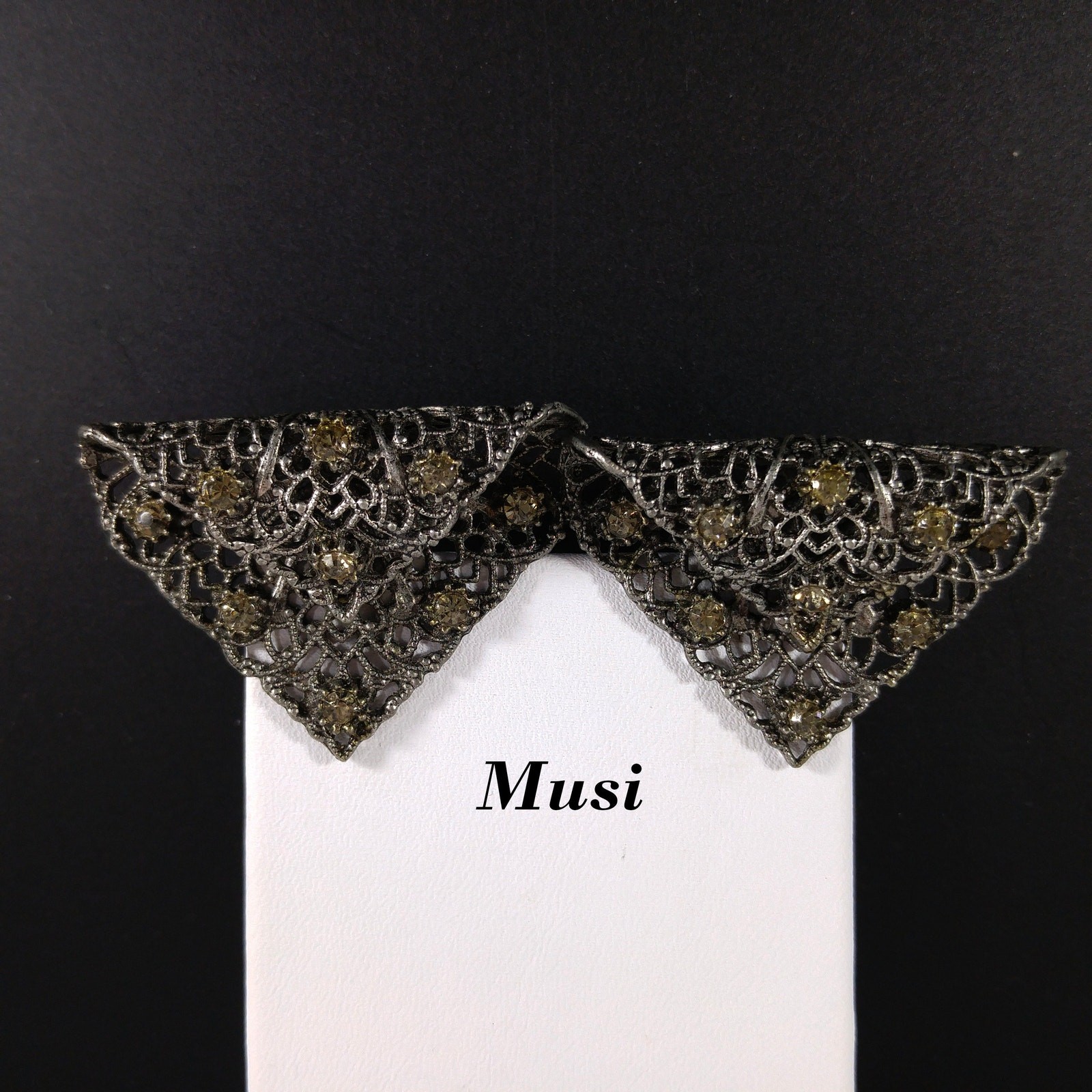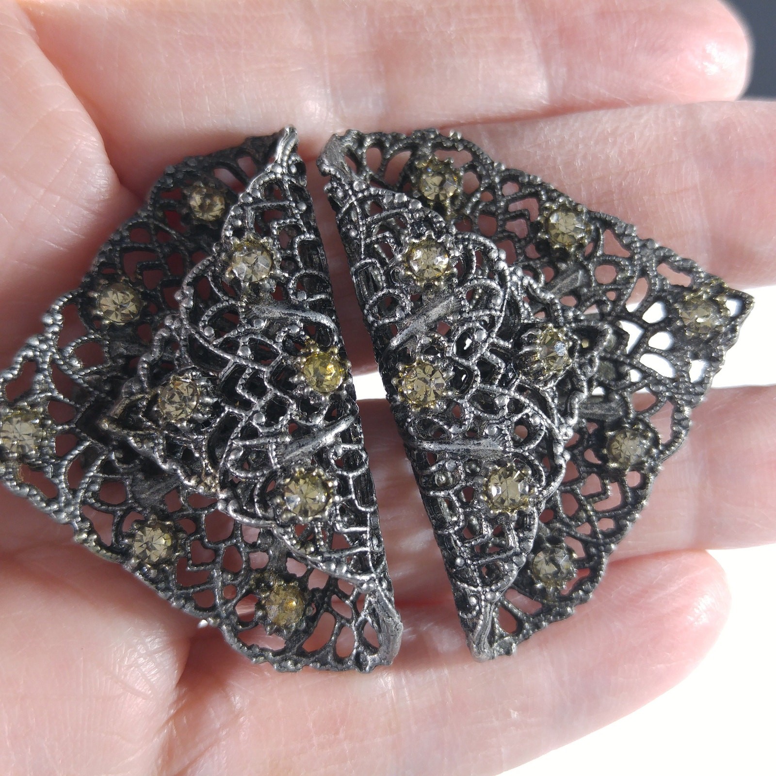 Vintage MUSI Filigree Shoe Clips, Gold Rhinestones, 1950s, 1 3/4 Inches