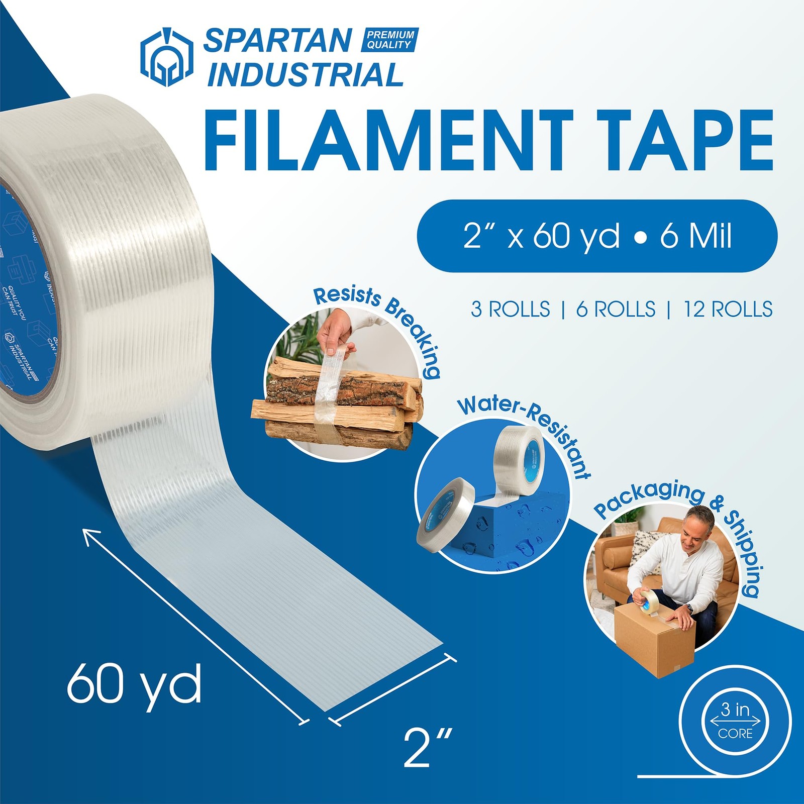 - 2 X 60 yd Filament Strapping Tape - 3 Rolls of Package Tape for Sealing, B...