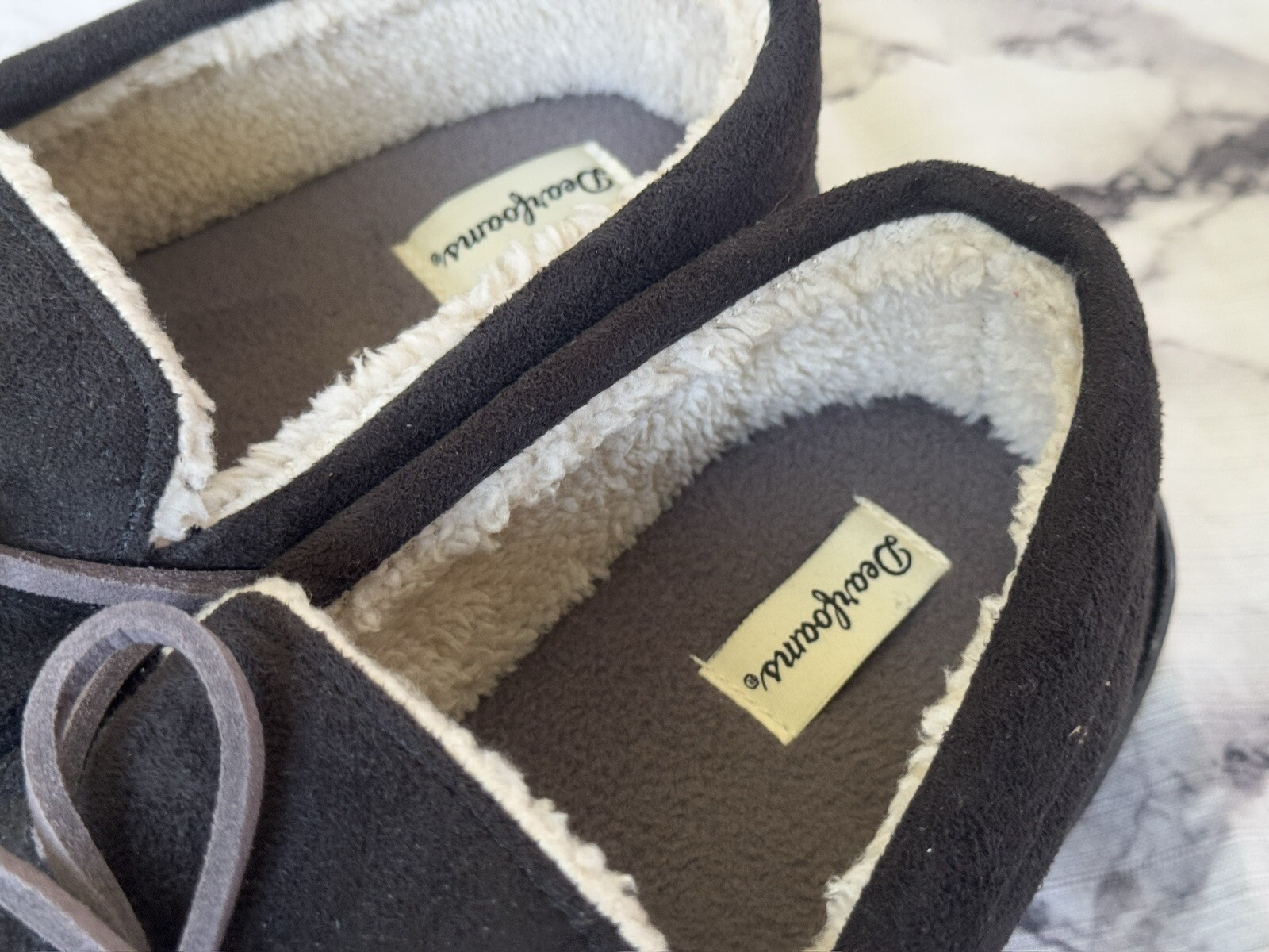 как выглядит Slippers Dearfoams Men Shearling Side Stitch Moc Black Size 11-12 New фото