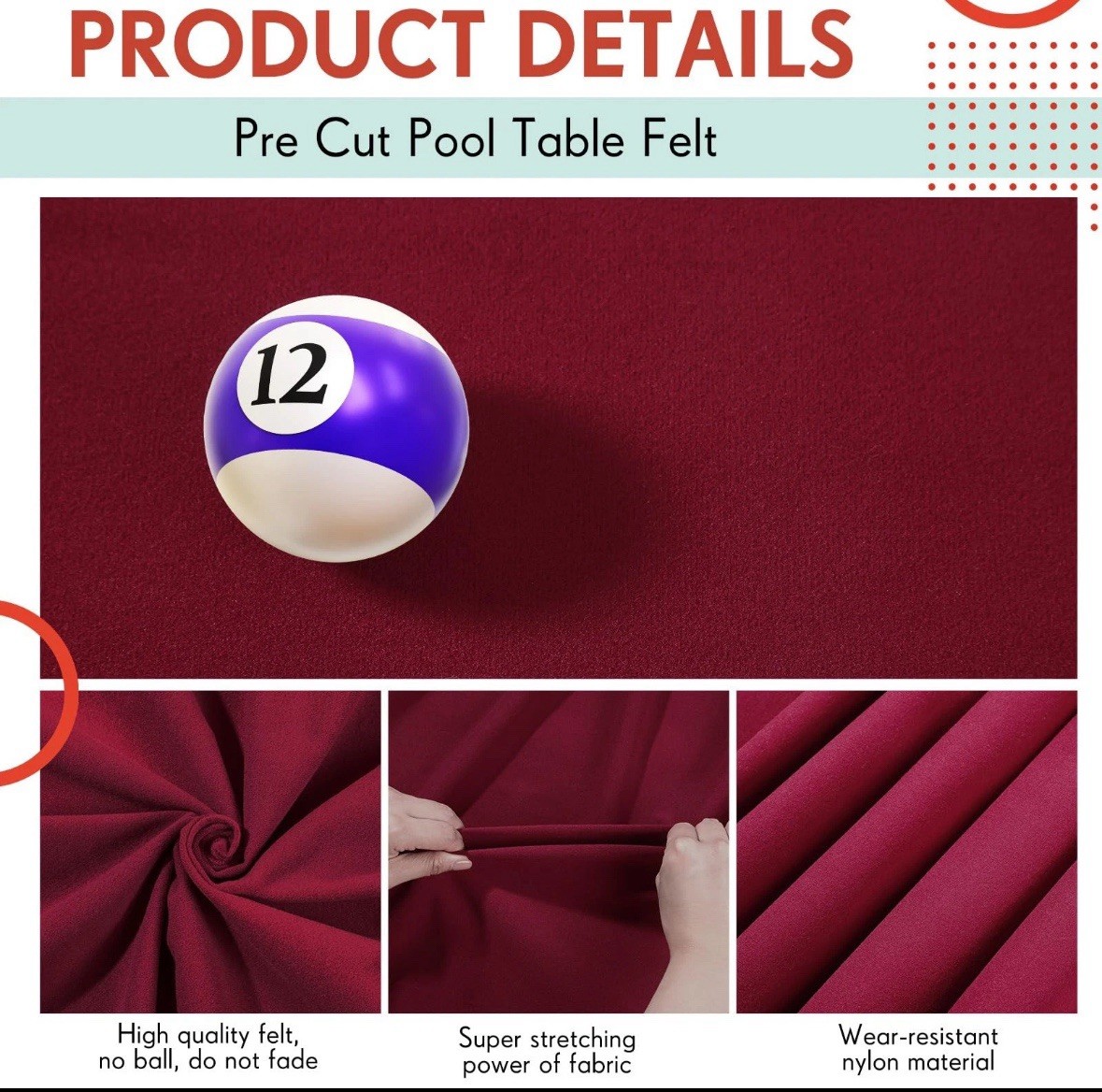 Mixweer 8.53ft Pool Table Felt, 6 Pre-Cut Strips, Billiard Cloth - Red