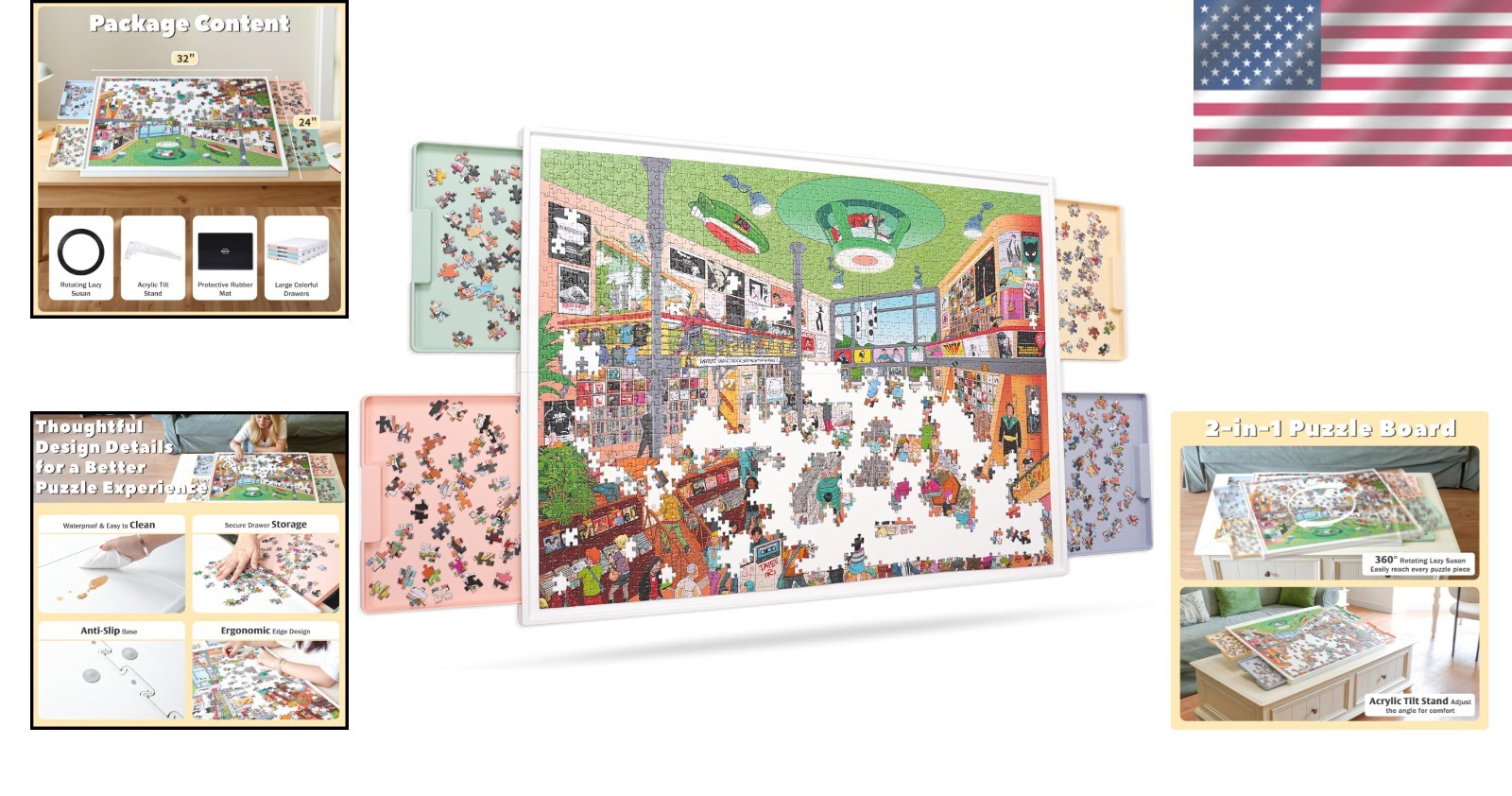 Особенности: 2-in-1, Rotating, Tilting, Portable, Color-Coded Drawers, Pet-Friendly, Protective Rubber Mat, Lightweight, Durable, Easy to Store, Dust-Proof, 360° Smooth-Turning Lazy Susan, Customizable Tilt Stand, Fits 1500-Piece Puzzles, Warm-White Surface, Organized Sorting with Drawers, Spacious Drawer Design, Sturdy Construction, Easy to Move, Ideal for Puzzle Lovers
