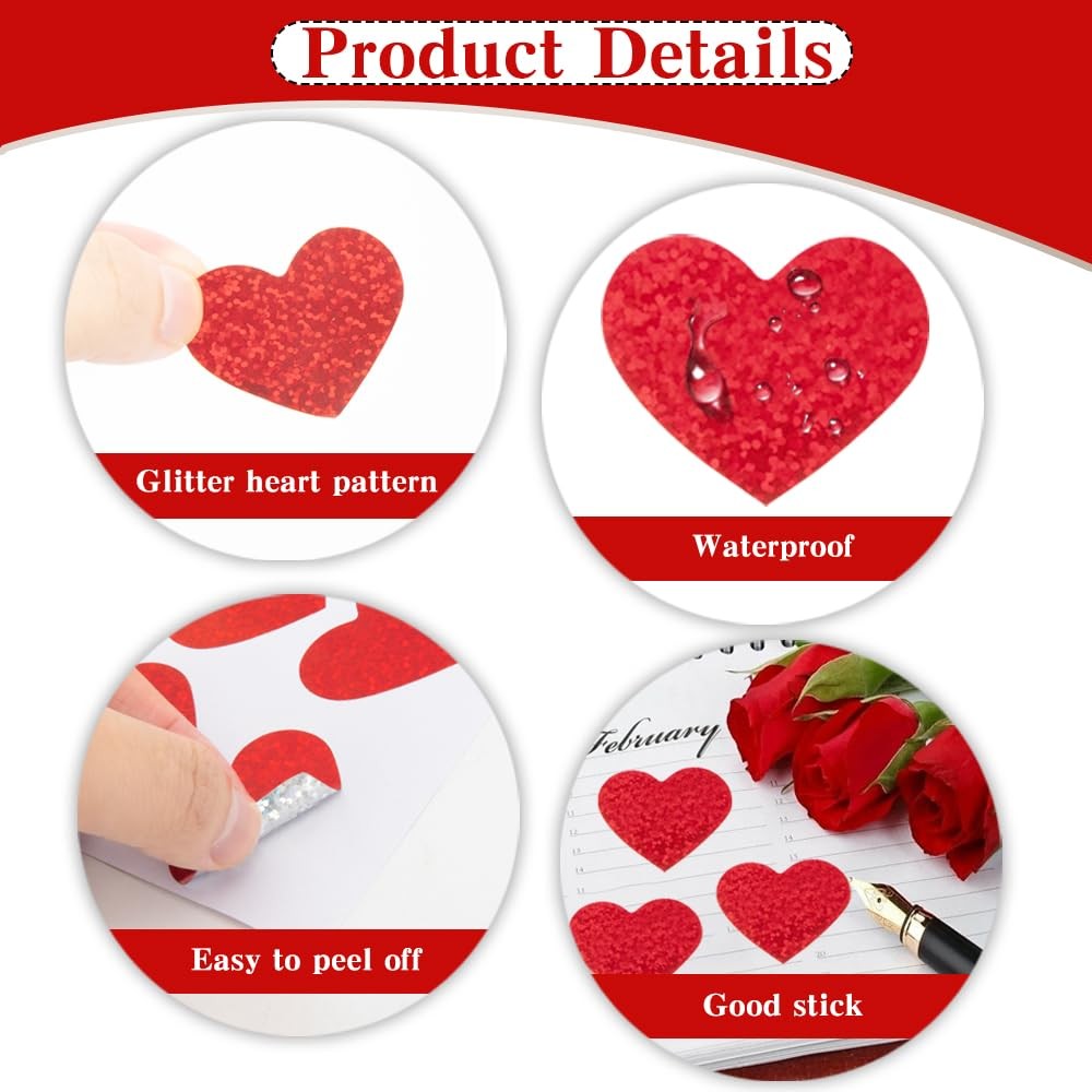 как выглядит Heart Stickers, 320 PCS Heart Stickers for Kids, 1.5 Inch Large Glitter Red H... фото