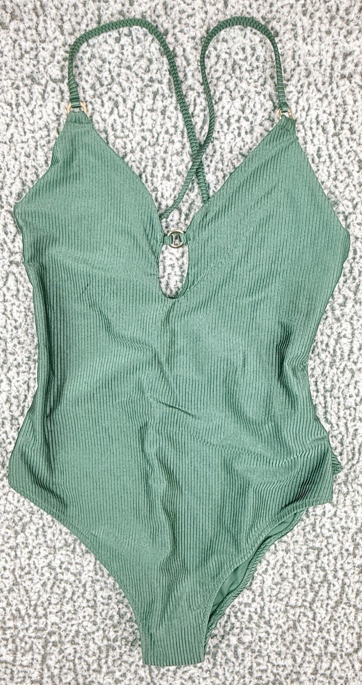 как выглядит Aerie Shine Rib One Piece Swimsuit M Green Gold Ring Cutout Sycamore NWT фото