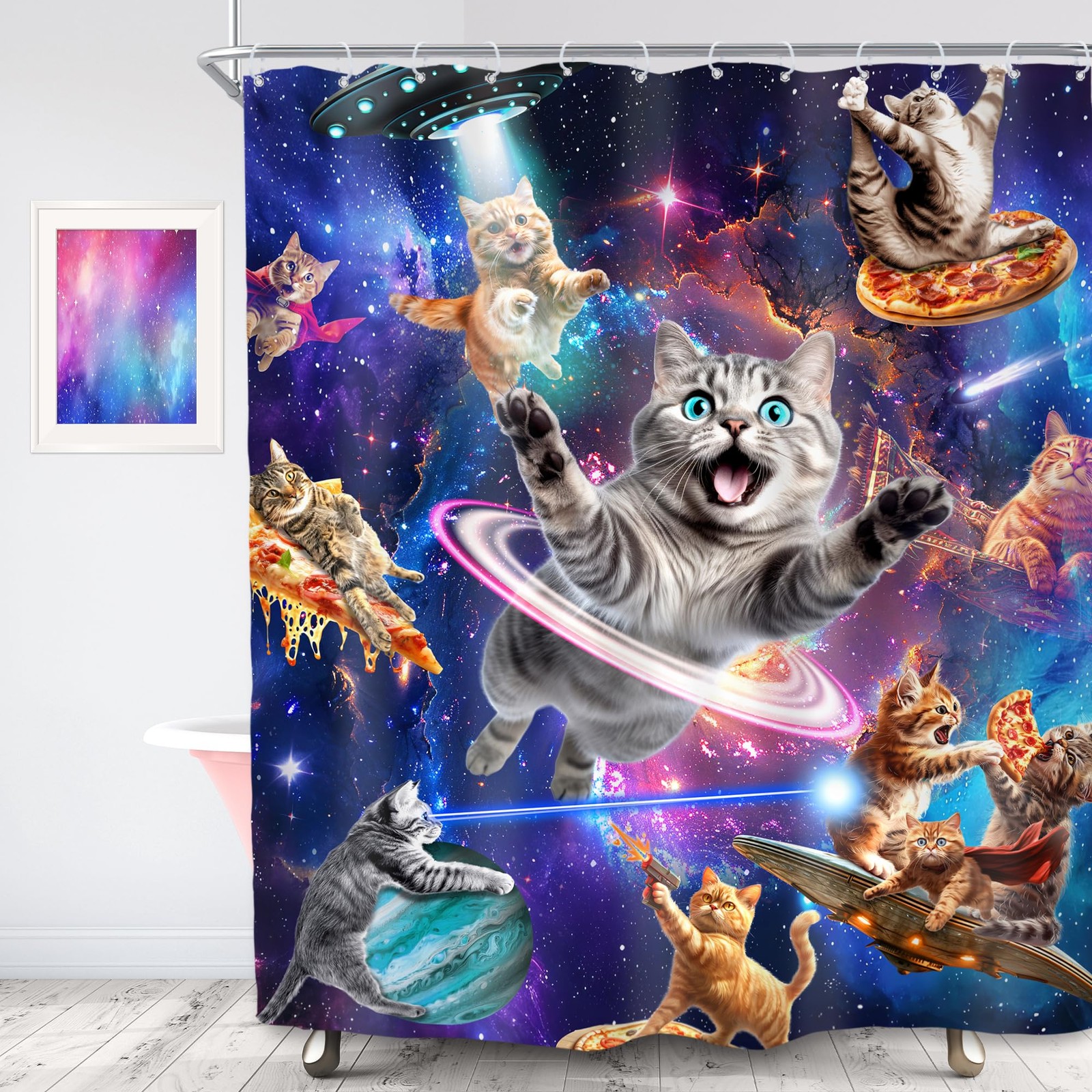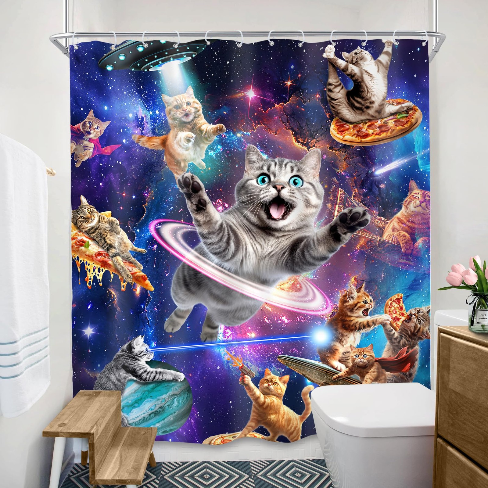 Funny Cat Shower Curtain 60Wx72L Inch Kids Space Galaxy Cute Fun Cool Pet Ani...