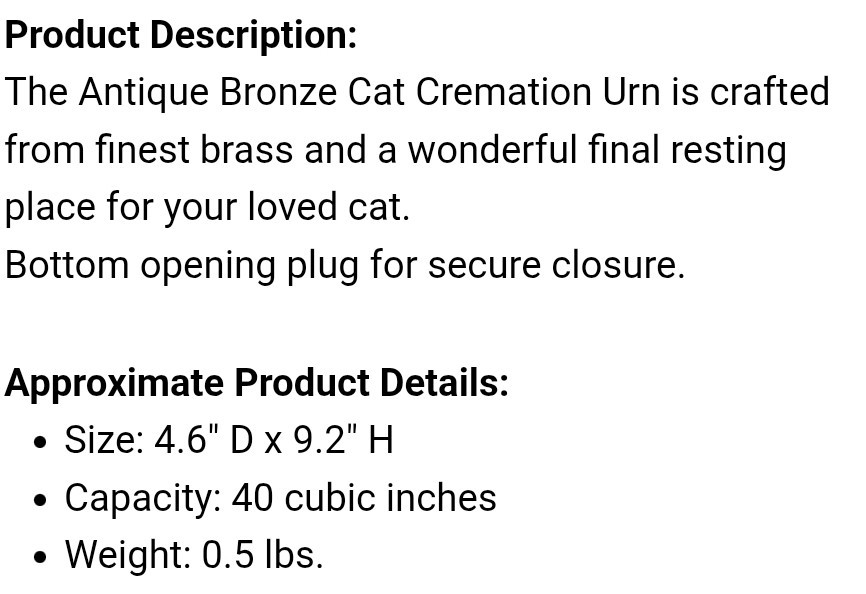 • Cat Cremation Bronze Urn, Black, Slightly Used