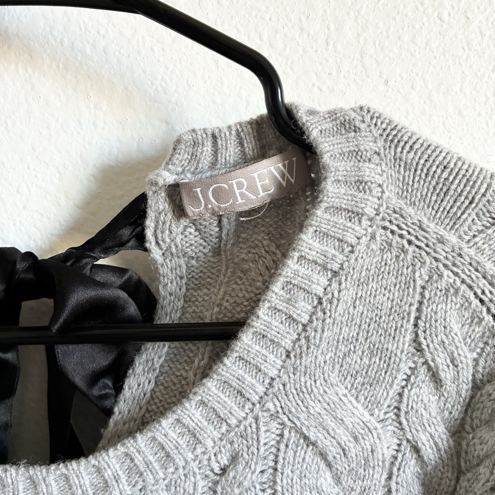 J Crew Tie Bow Back Cable Knit Wool Blend Boxy Preppy Cute Sweater Gray Large