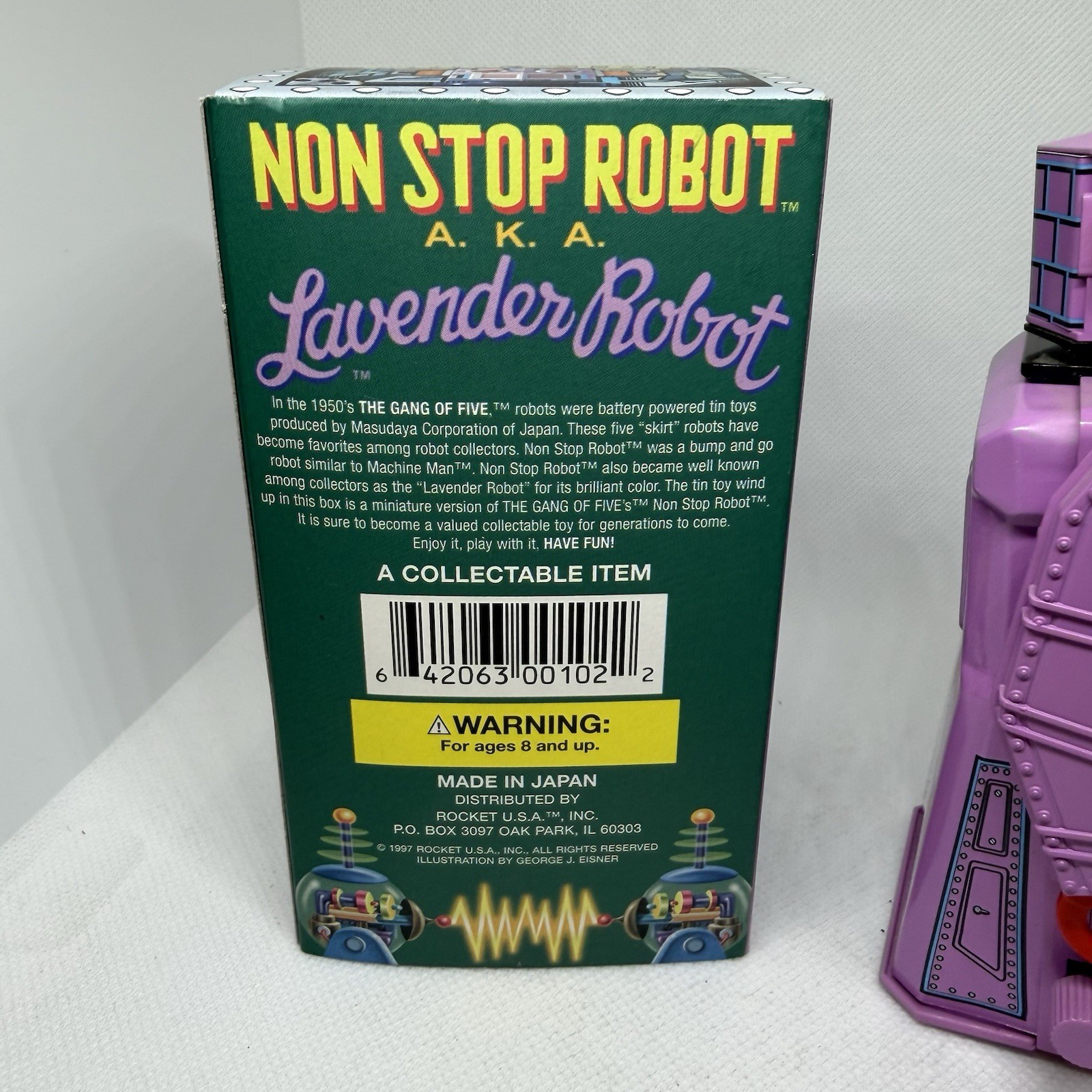 1997 JAPAN GANG OF FIVE NON STOP WIND UP TIN ROBOT TOY NEW IN BOX Lavender