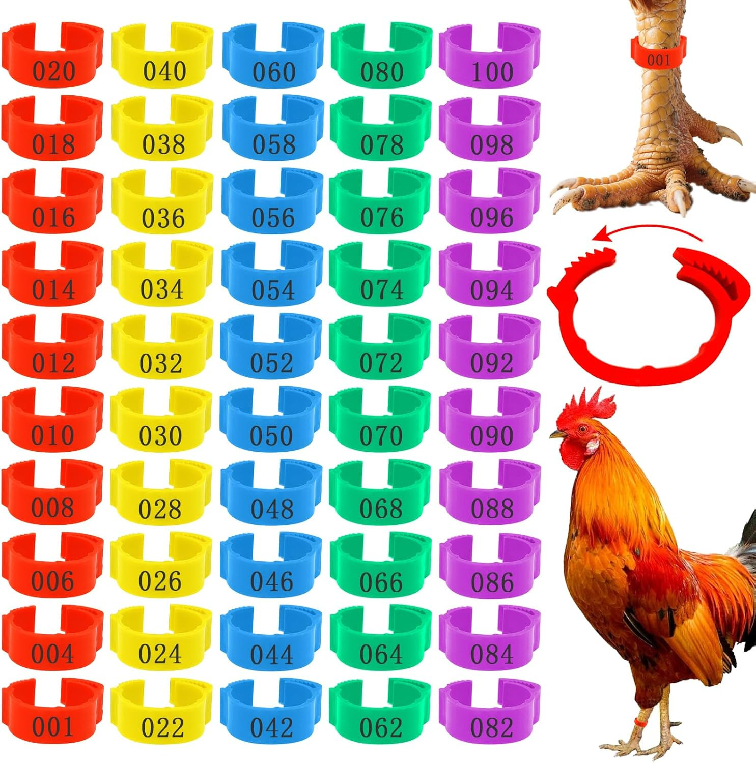 как выглядит 100 Pcs Adjustable Chicken Leg Bands Tags, Colorful Readable Numbered PVC Ide... фото