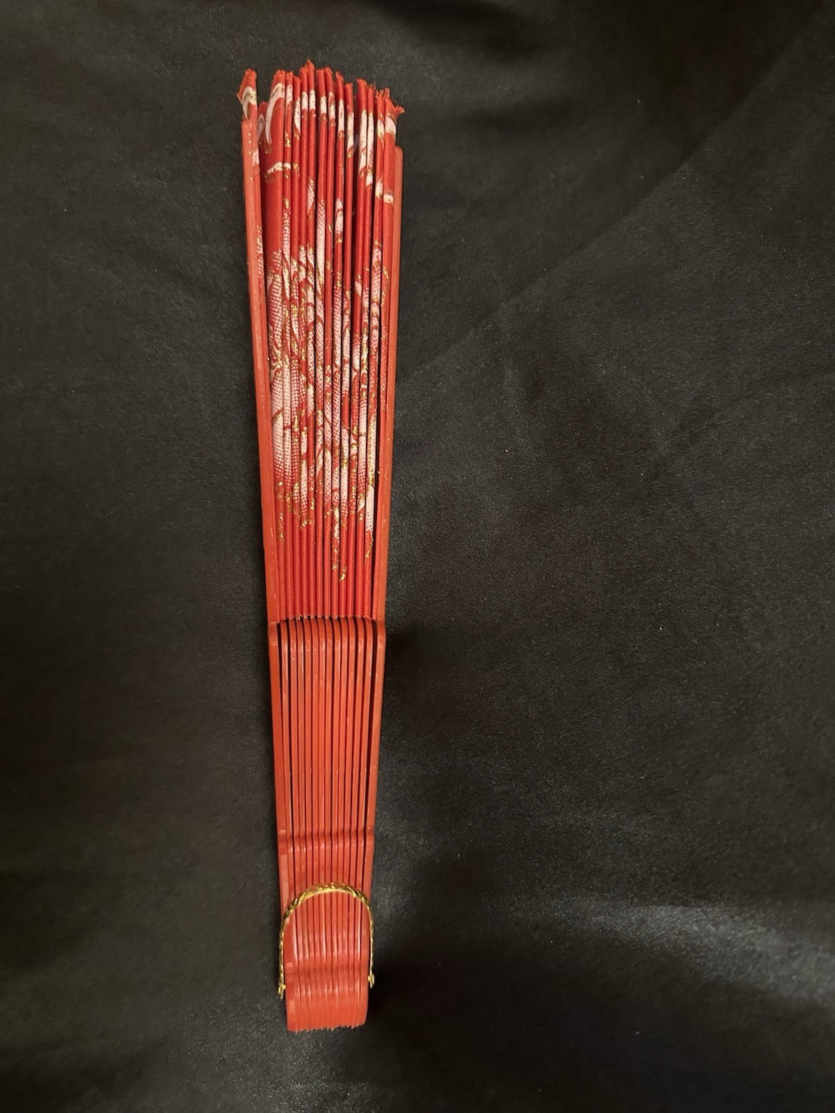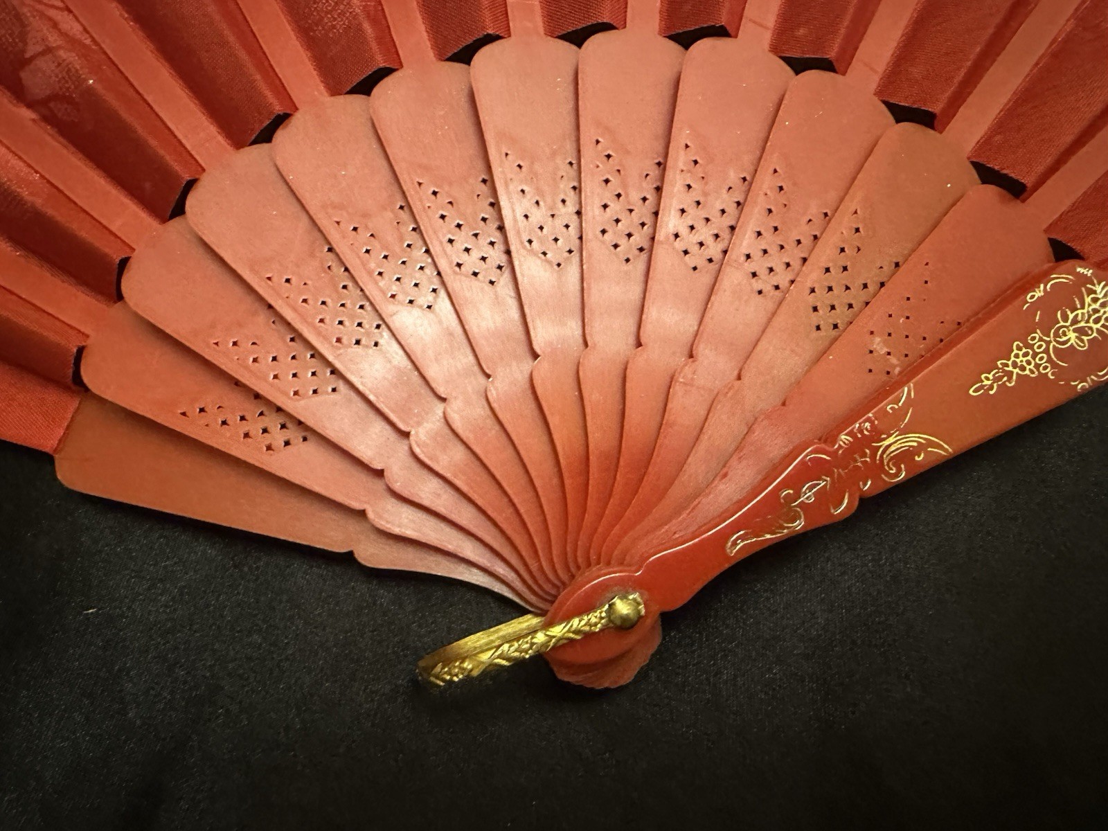 как выглядит Vintage Barcelona Spain Folding Hand Fan Red Floral Gold 17 Wide Open фото