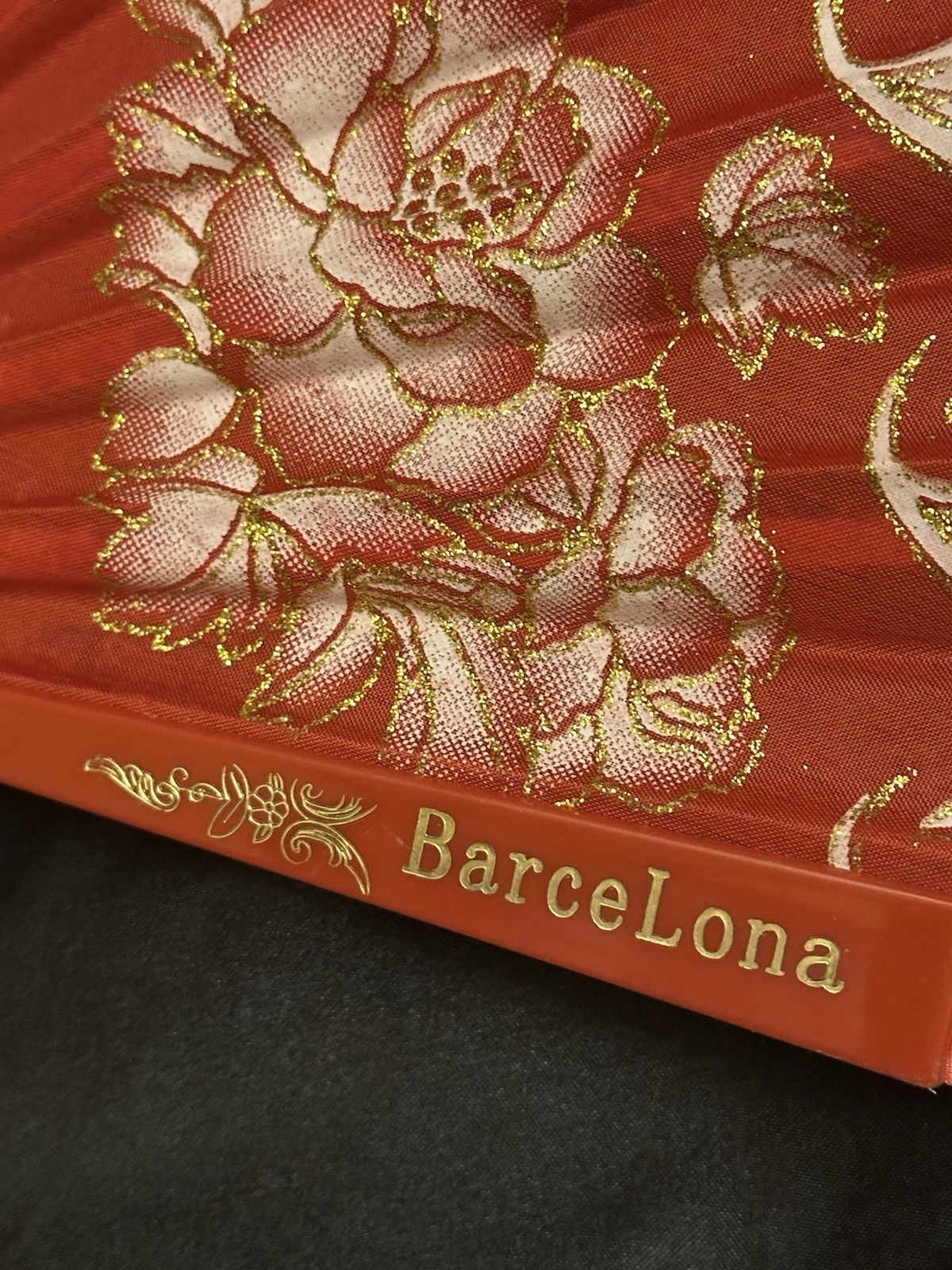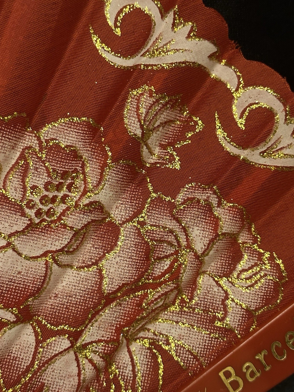 Vintage Barcelona Spain Folding Hand Fan Red Floral Gold 17 Wide Open