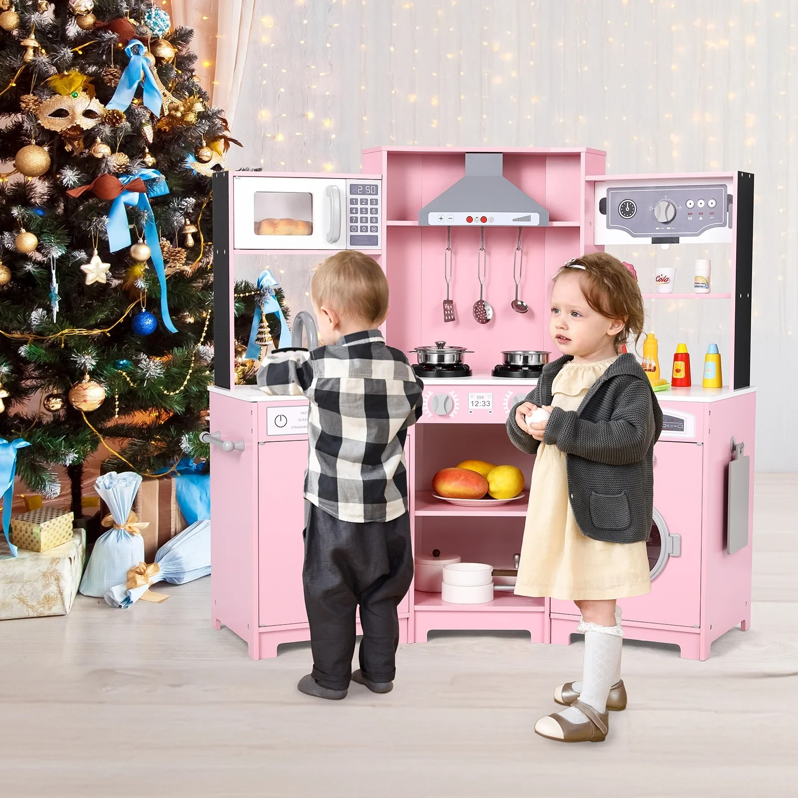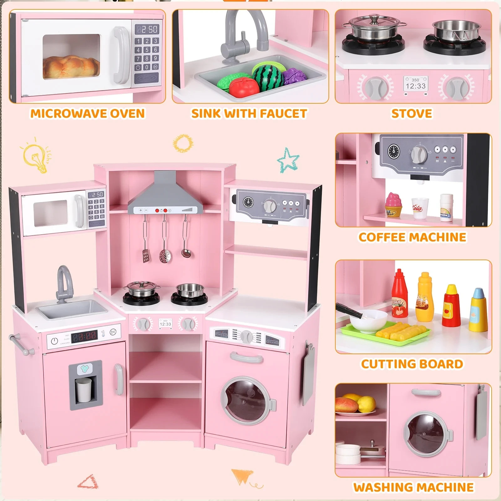 Kids Pretend Play Corner Kitchen Wooden Toy Set w/ Lights,Sounds Girls Gift Pink