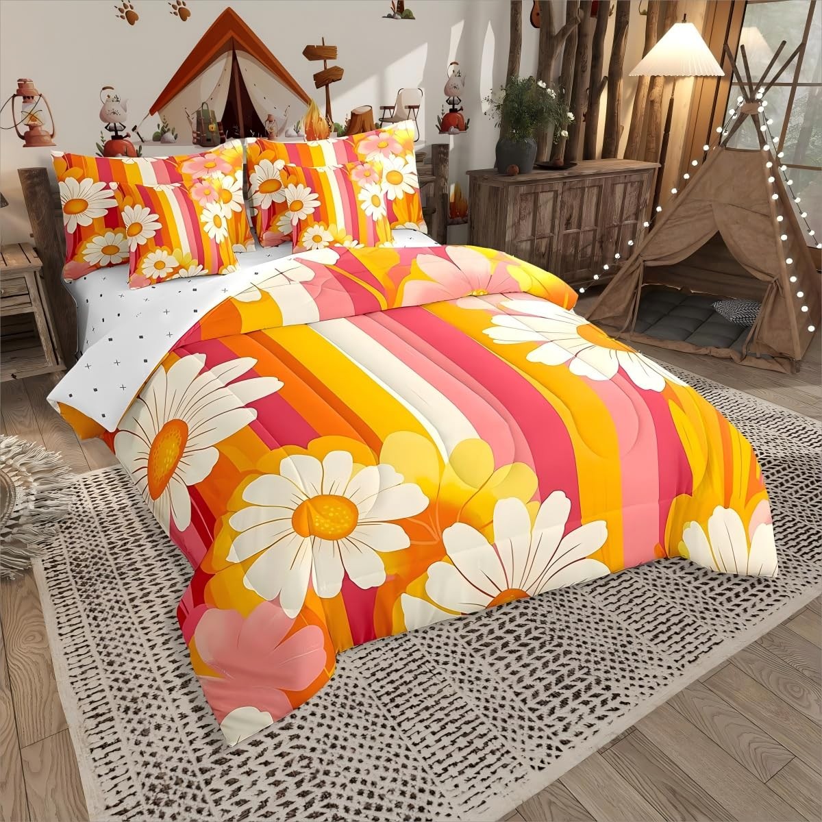как выглядит White Daisy Floral Bedding Set 7 Pieces For Kids Girls Pink Flower Comforter ... фото