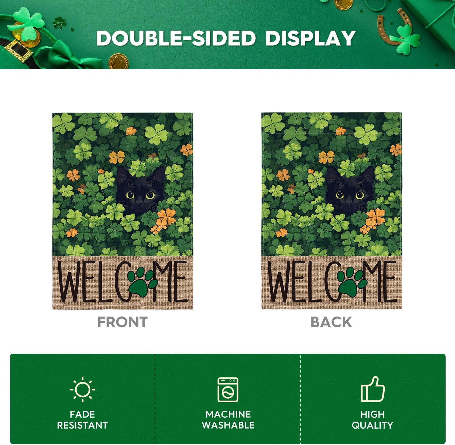 St. Patrick's Day Double-Sided Garden Flag with Black Cat and Shamrocks