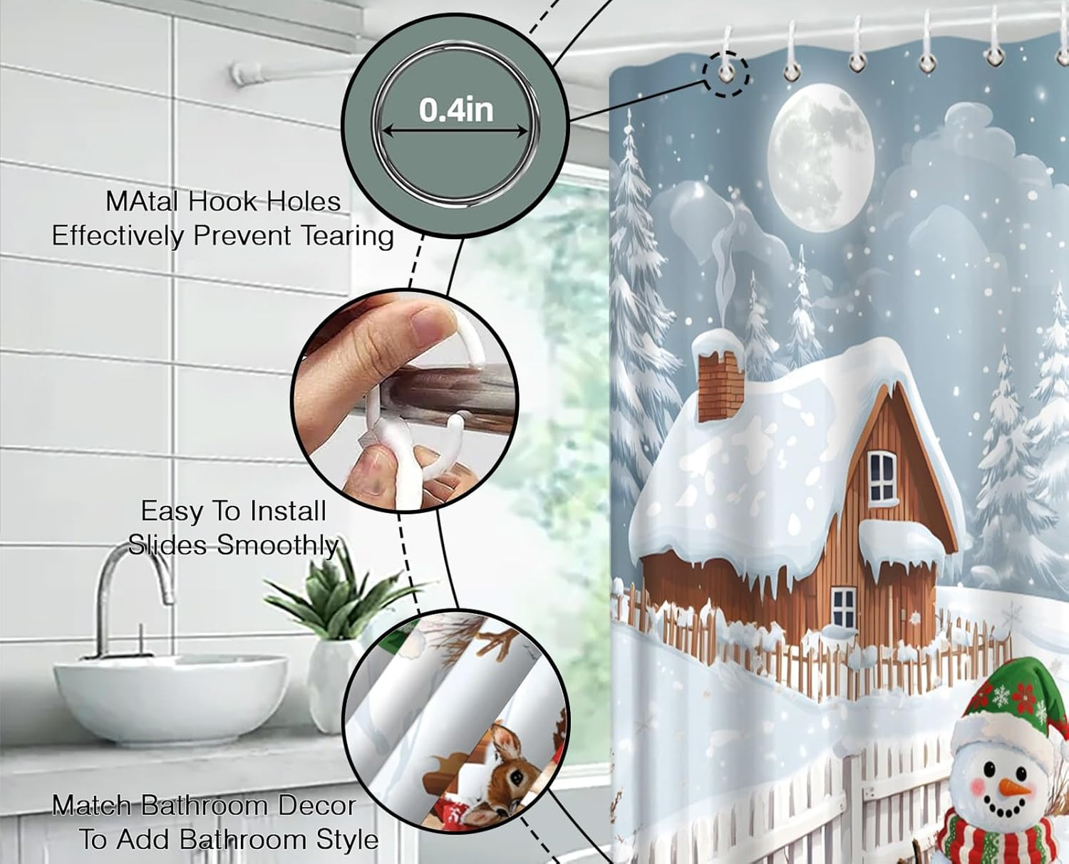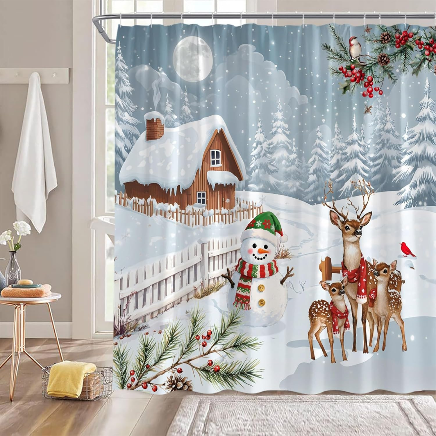 Winter Christmas Shower Curtain,Snowman Deer Decor for Bathroom,Rustic Forest Sn