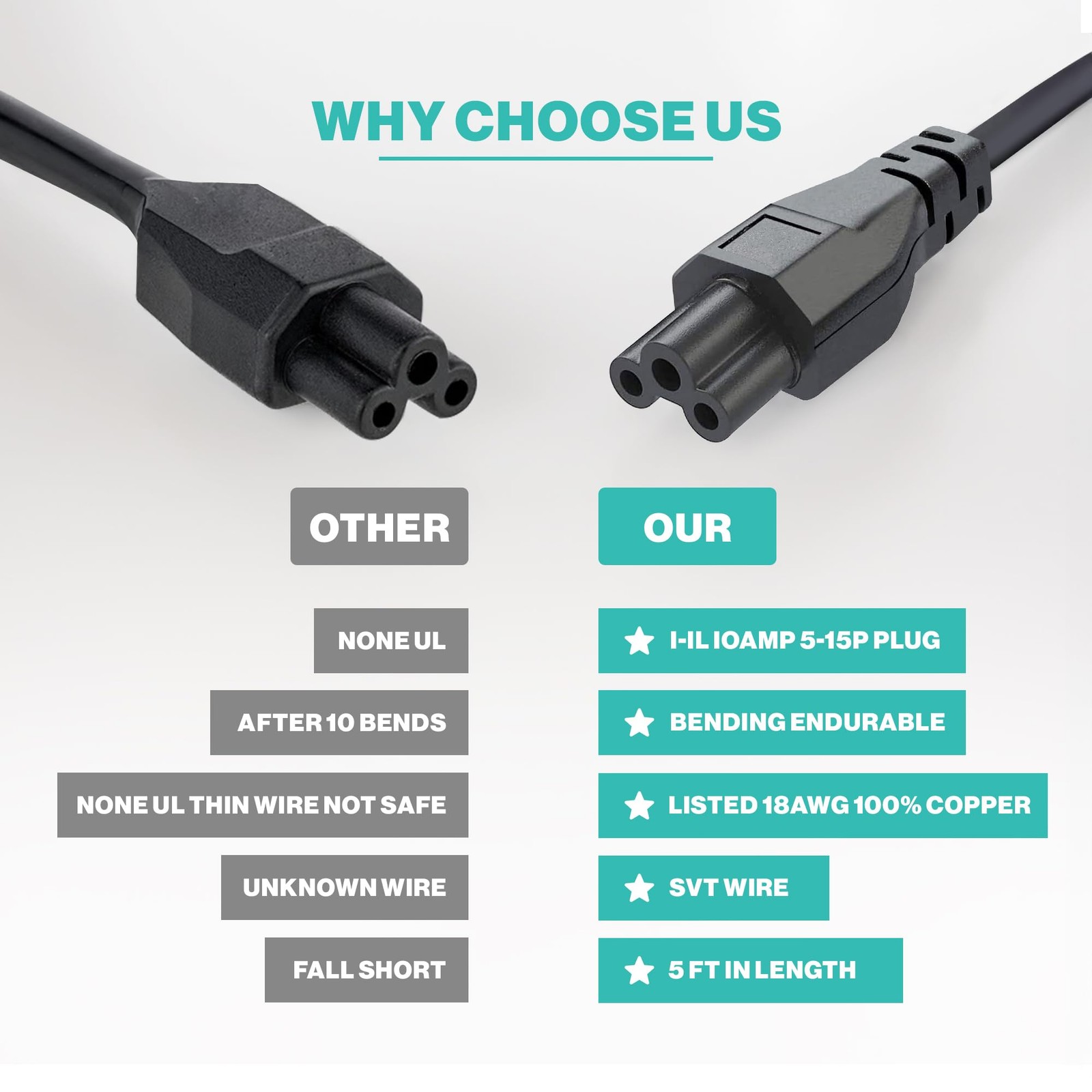 3 Prong AC Laptop Power Cord 5Ft Universal Cable 125V 5FT, Black