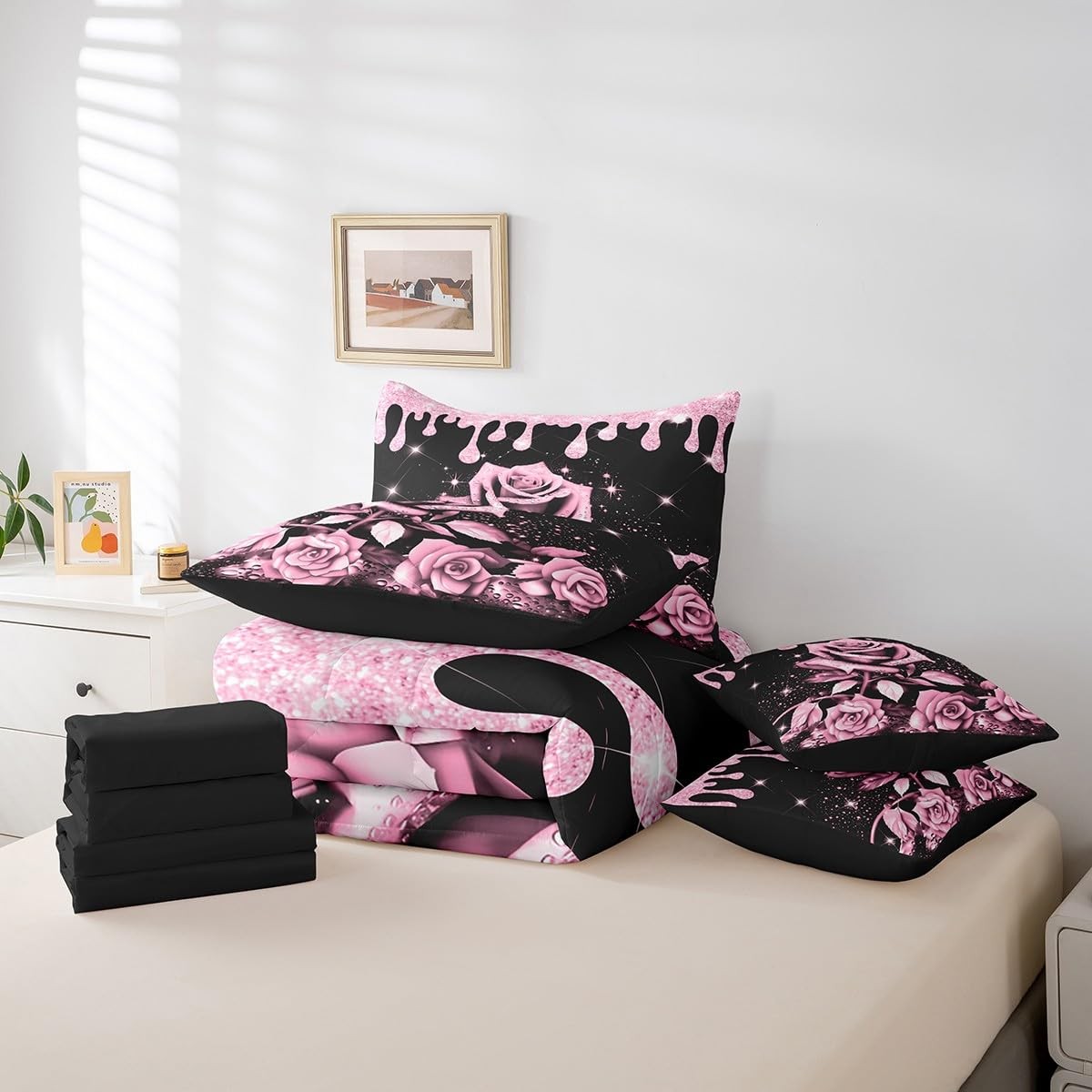 Pink Rose 7 Piece Bedding Set Twin Size for Kids Boys Girls Teens Toddler Ros...