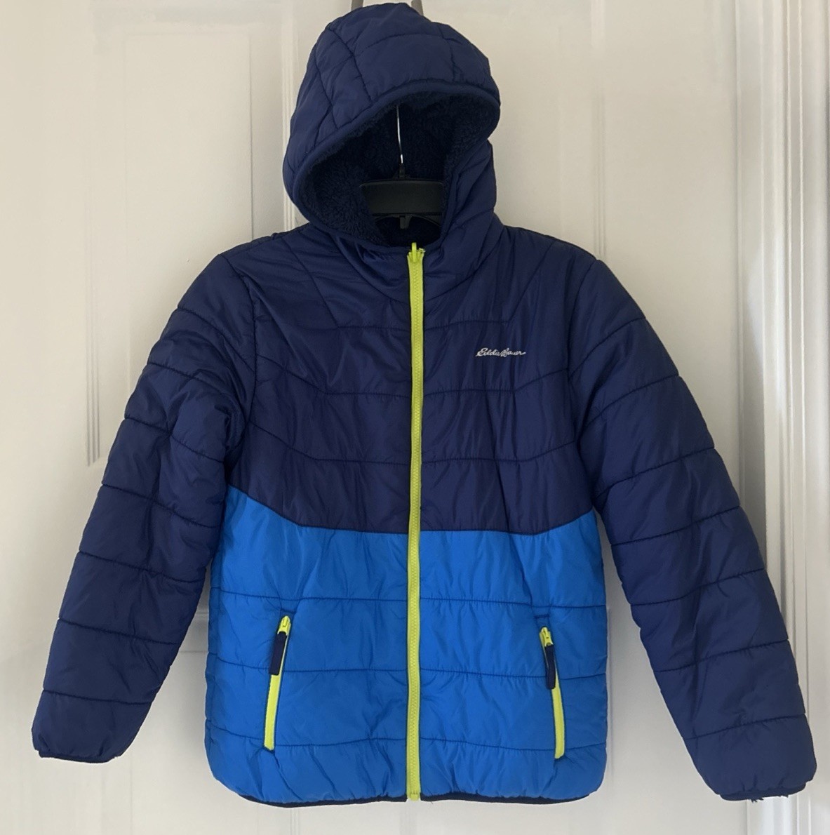 Eddie Bauer Reversible Blue Full Zip Puffer Hooded Jacket Fleece L 14/16