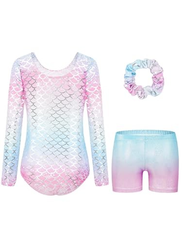 Leotards for Girls Gymnastics, Long Sleeve Sparkly 8-9 Years Mermaid Scale