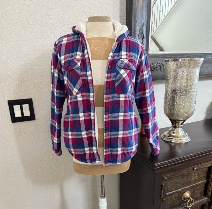 Boston Traders Jacket Hooded Sherpa Lined Pink blue Flannel Women's Size S