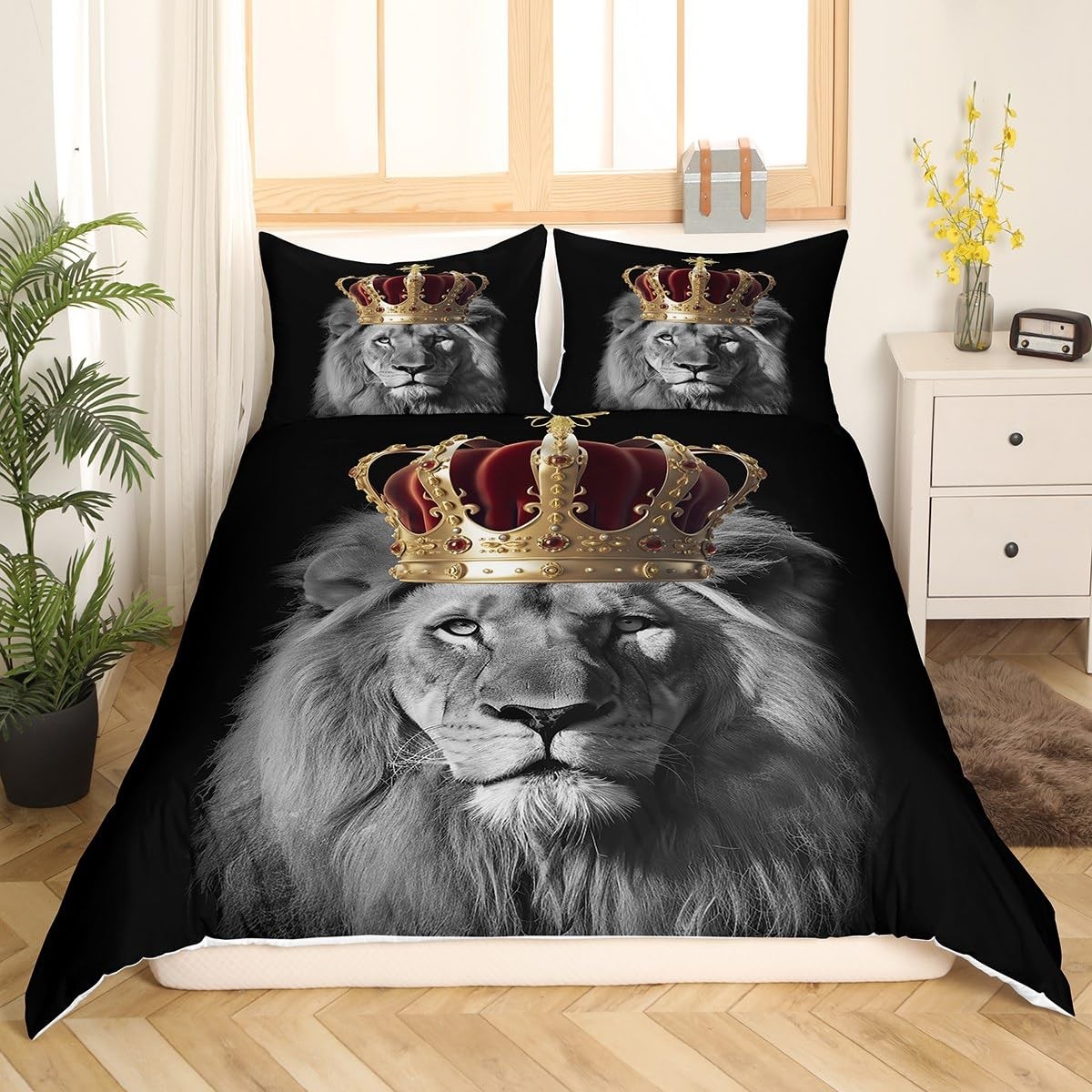 Wild Lion Kids Duvet Cover Set Full Size,Golden King Crown 3D Wildlife Comfor...