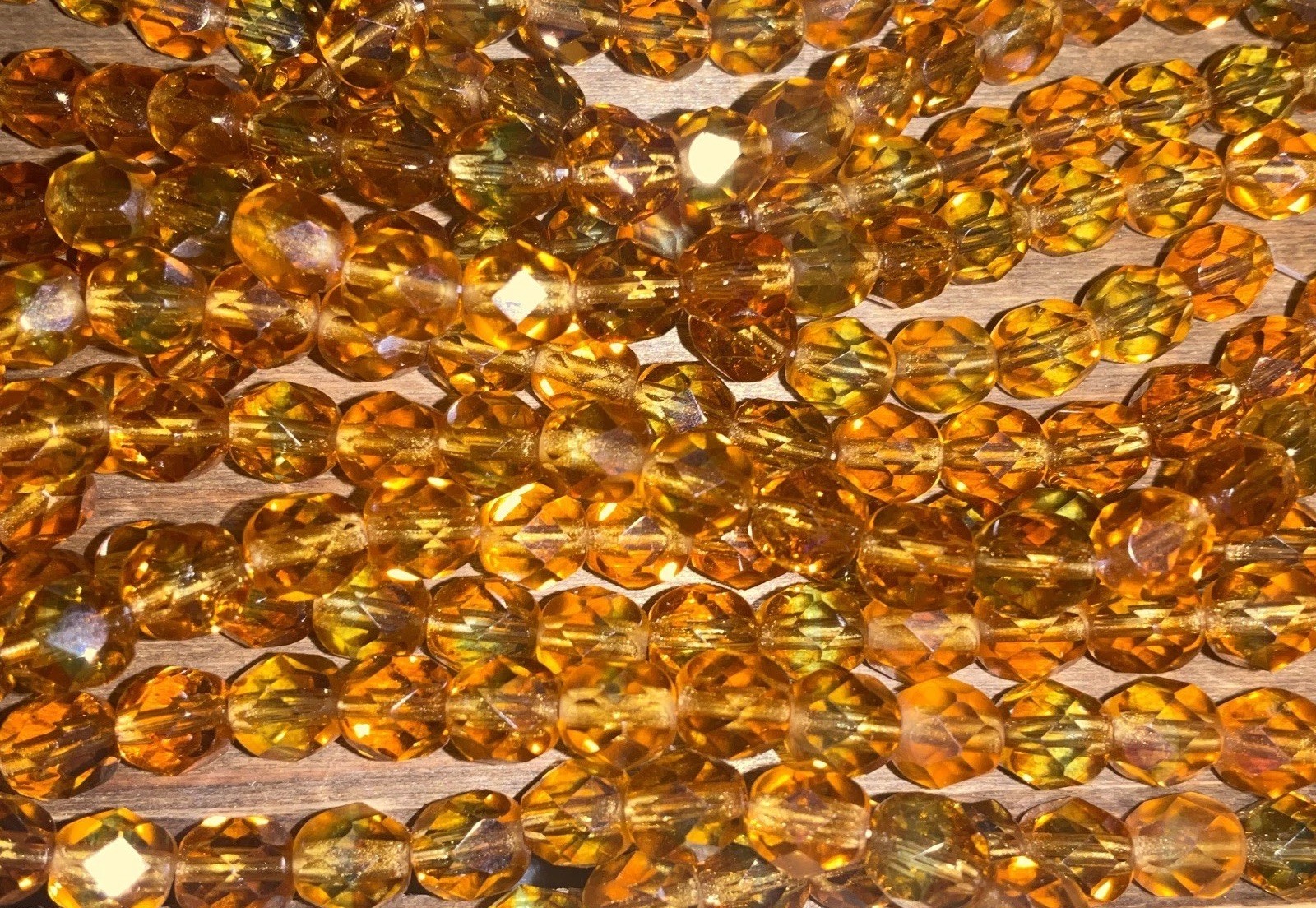6mm Faceted Topaz Czech Glass with Green Uranium Swirl Beads 25pcs.