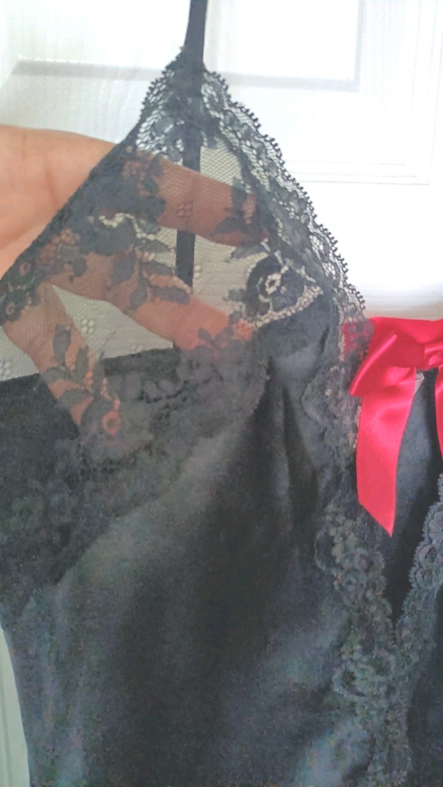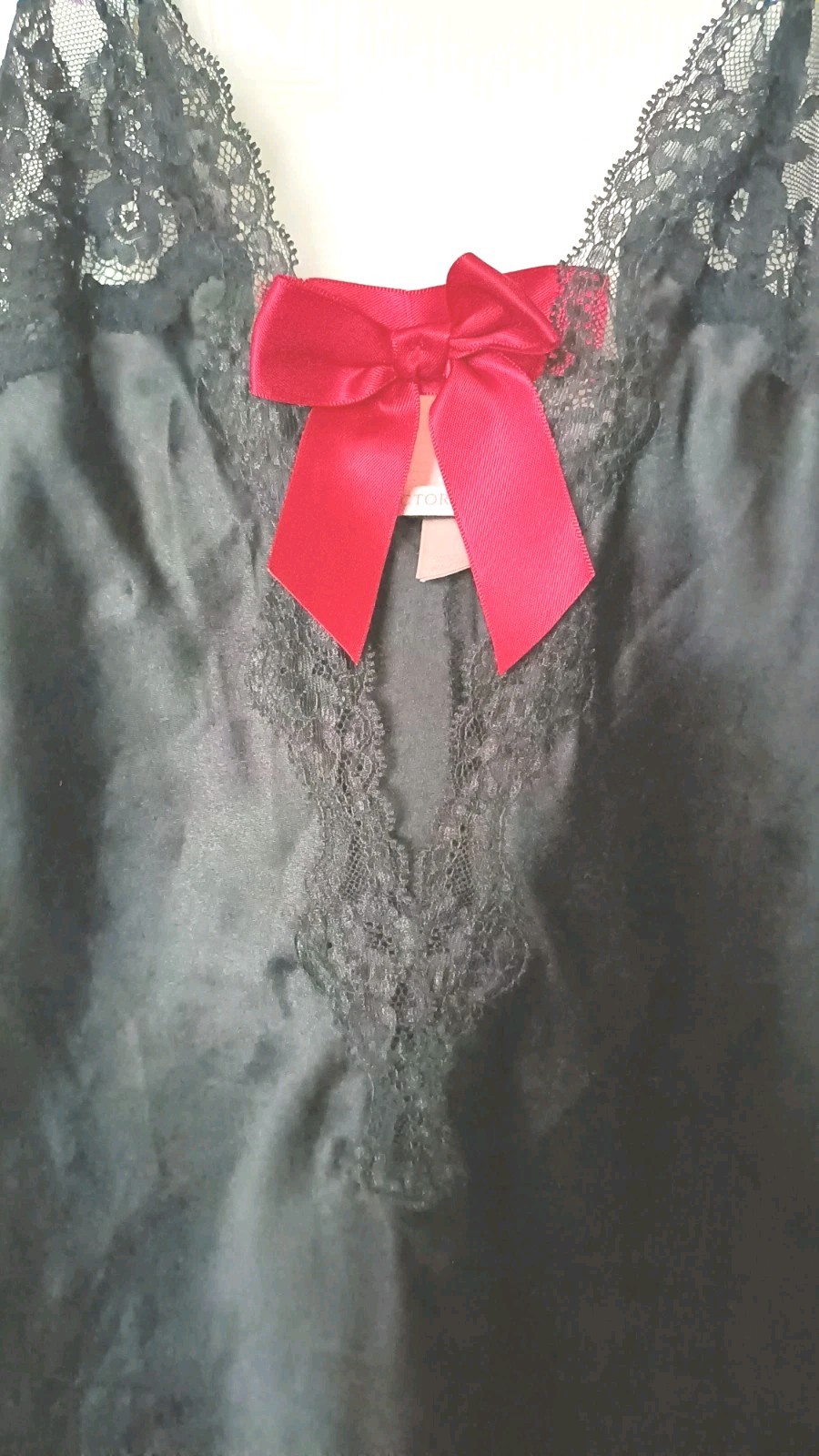 как выглядит Victorias Secret Satin Chemise Slip Size XS Black Lace Nightie Lingerie Red Bow фото