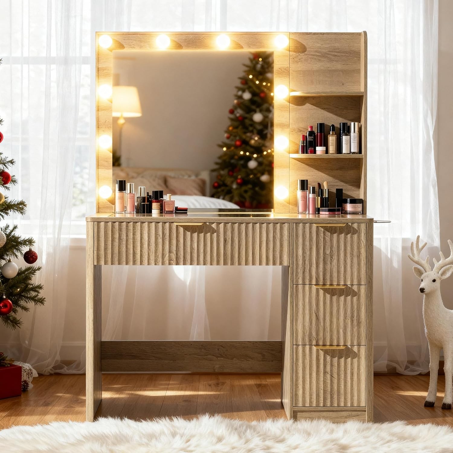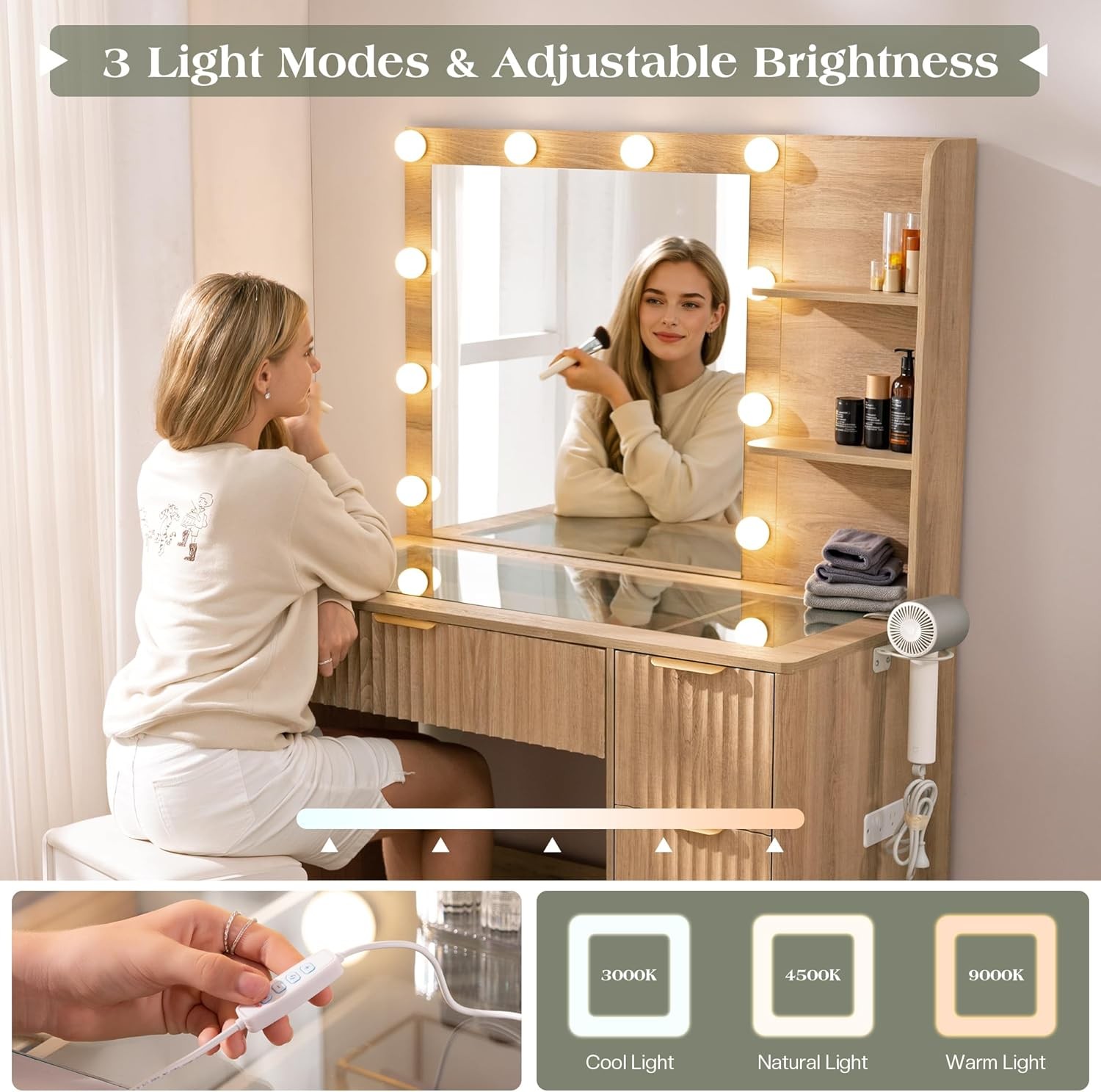 36 Makeup Vanity Desk with Mirror LED Lights, Fluted Vanity Table with 4 Draw