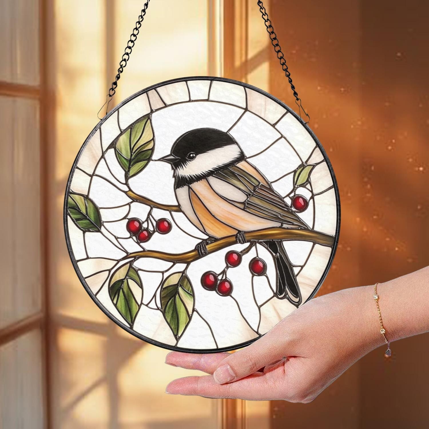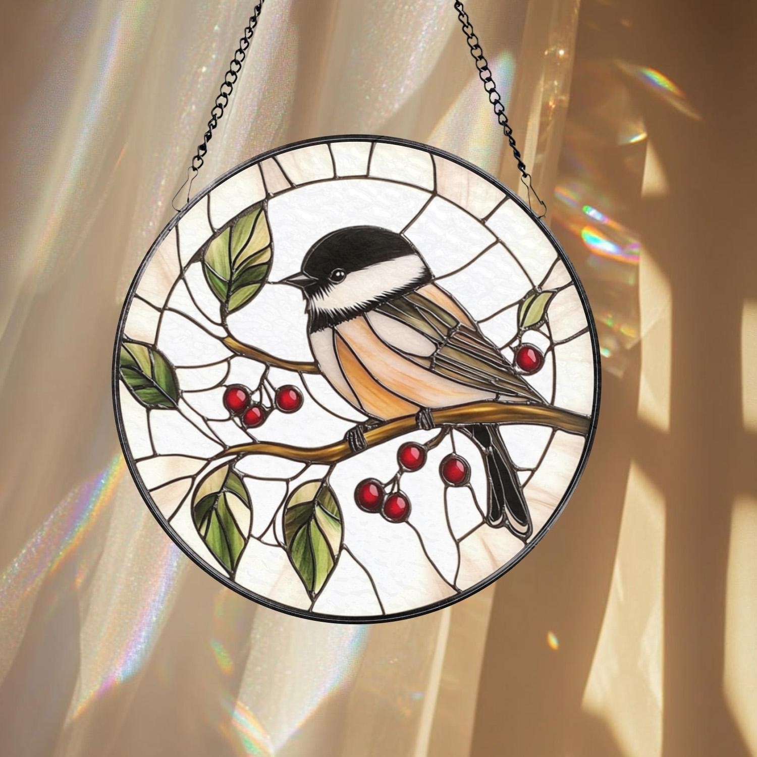 Chickadee Stained Glass Suncatcher: Round Bird Window Hanging decor
