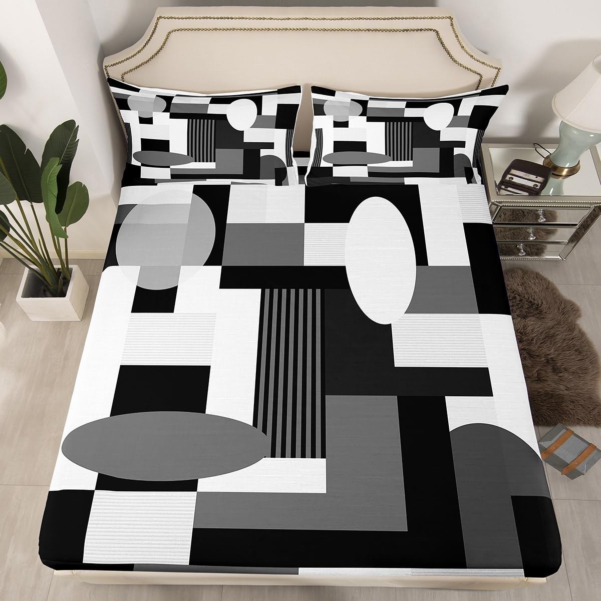 Geometric Fitted Sheet Full Size Black White Gray Bedding Set for Boys Girls ...