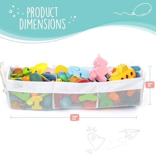 Large Bath Toy Organizer - 3 Compartment Quick-Dry Mesh Holder with Hooks - Kids
