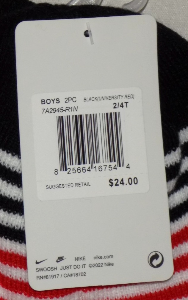 Nike Kids Boys' Beanie with Gloves 2 pc set BlkWhtRed 2/4T New