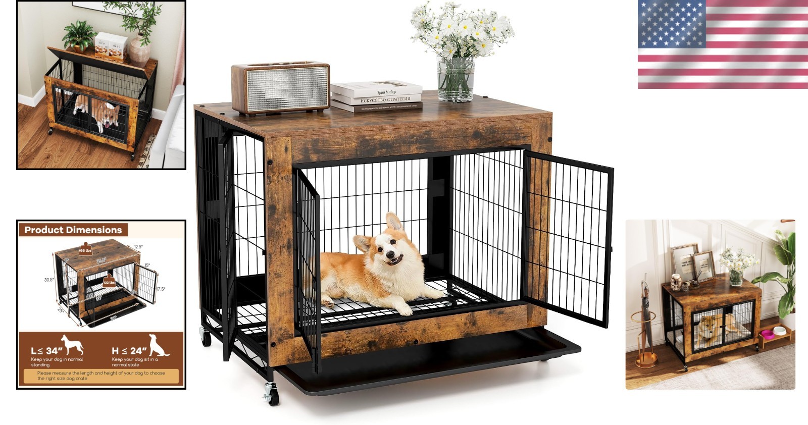 как выглядит Rustic Brown Portable Dog Crate Furniture with Removable Tray Universal Wheels фото