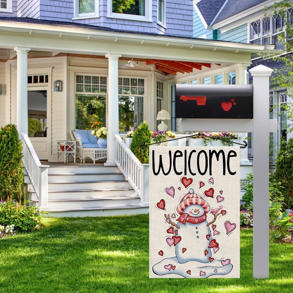 Snowman Love Heart Welcome Garden Flags Burlap 12x18 Inch Double Sided Outsid...