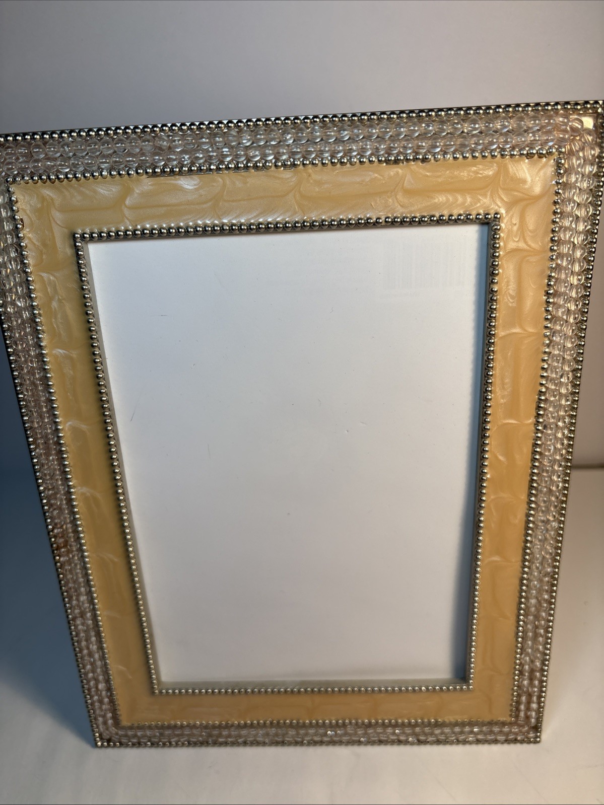 как выглядит Vintage Thompson Butter Yellow Enamel Beaded Metal Picture Frame 5 X 7 фото