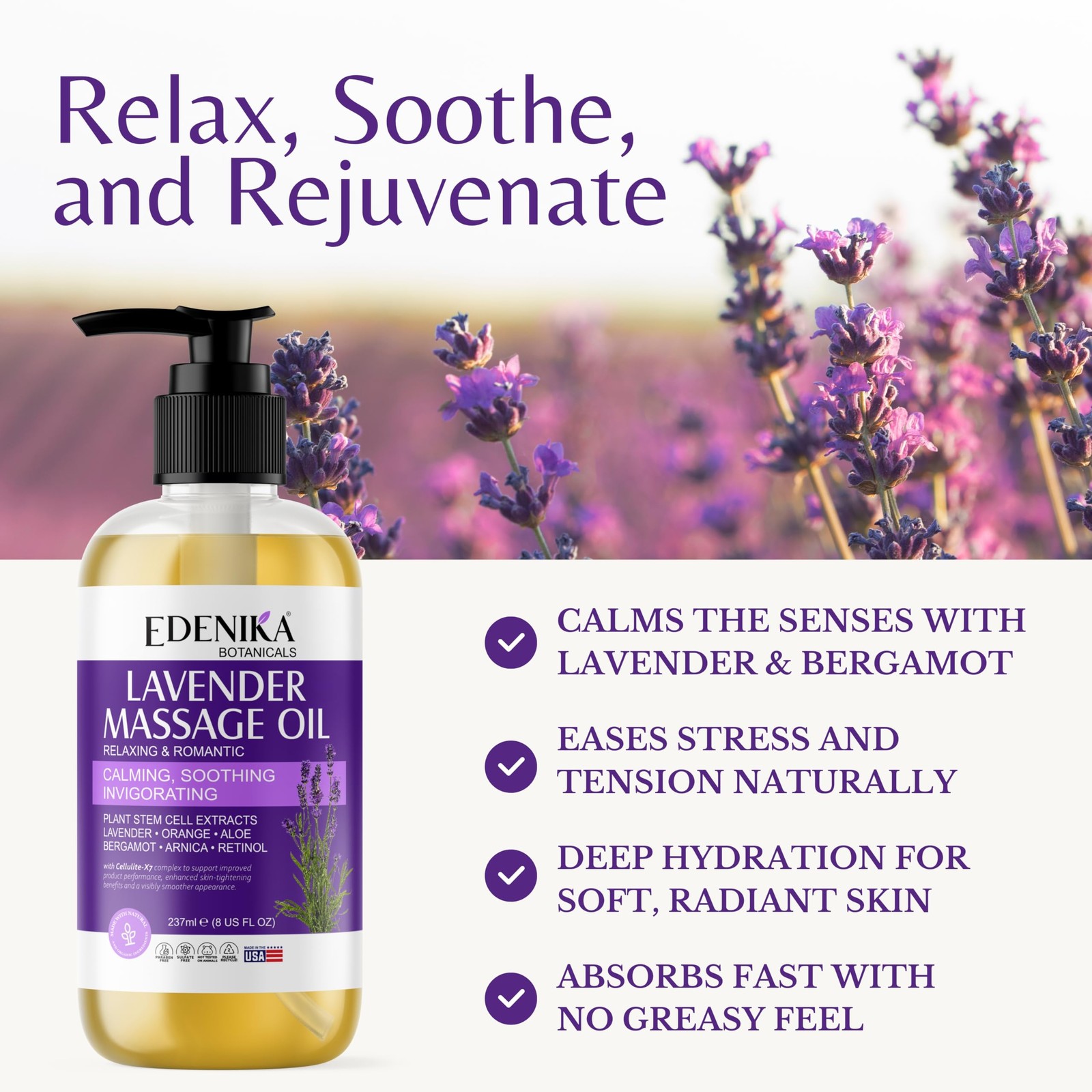 Edenika Botanicals Lavender Massage Oil for Skin, 8 Fl Oz Pack of 2 , Clear