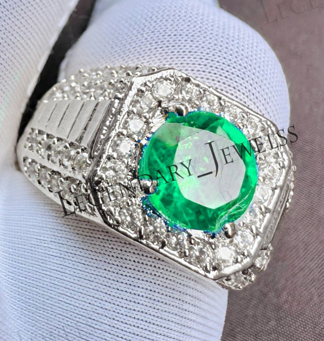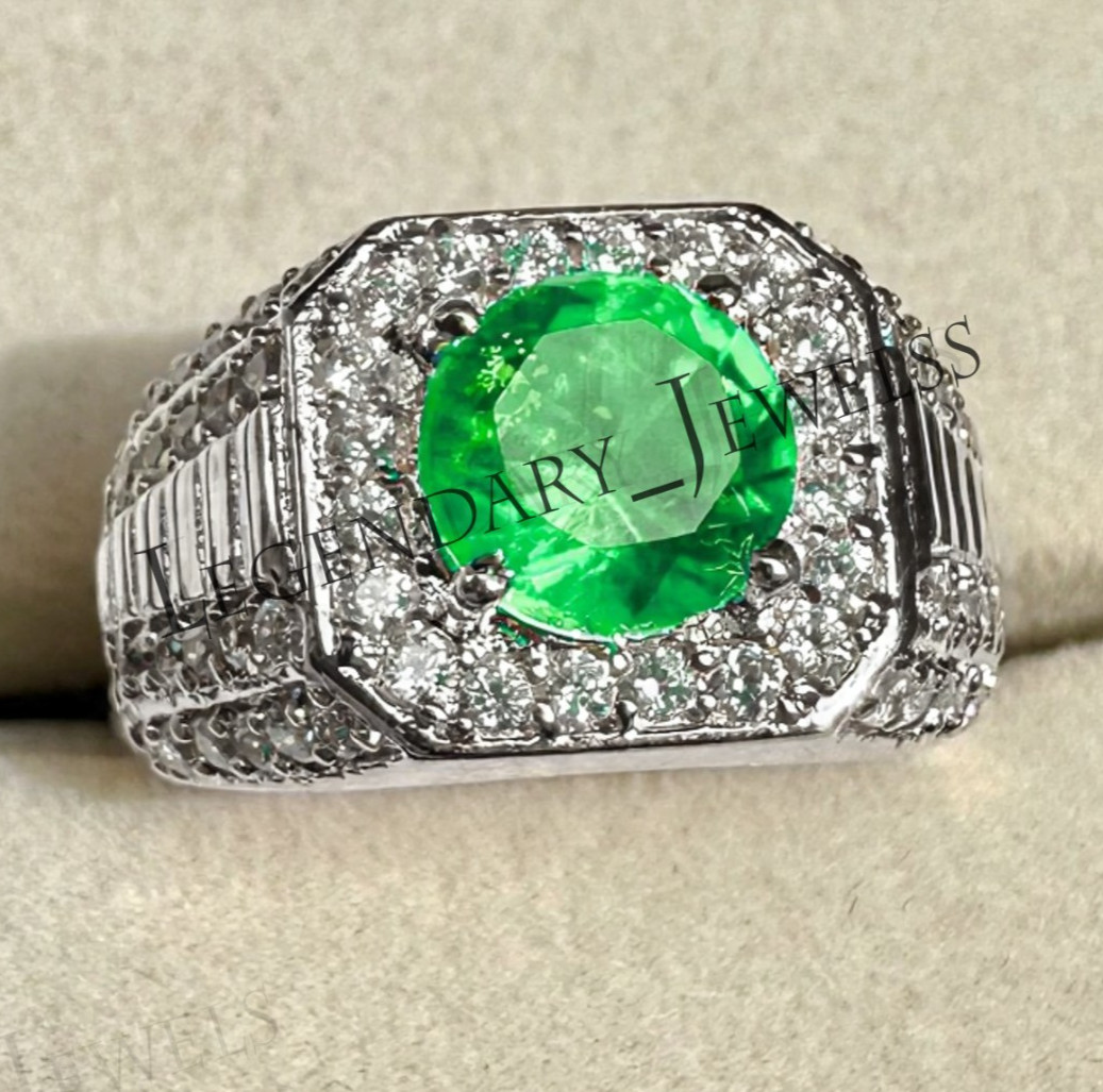 Green Emerald Gemstone Ring For Men's With 925 Sterling Silver Round Cut Ring
