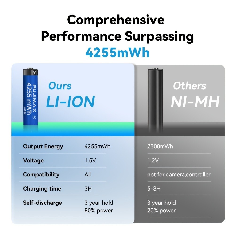 PUJIMAX AA Lithium Batteries 4255mWh 8-Pack Rechargeable w/Smart Charger NEW