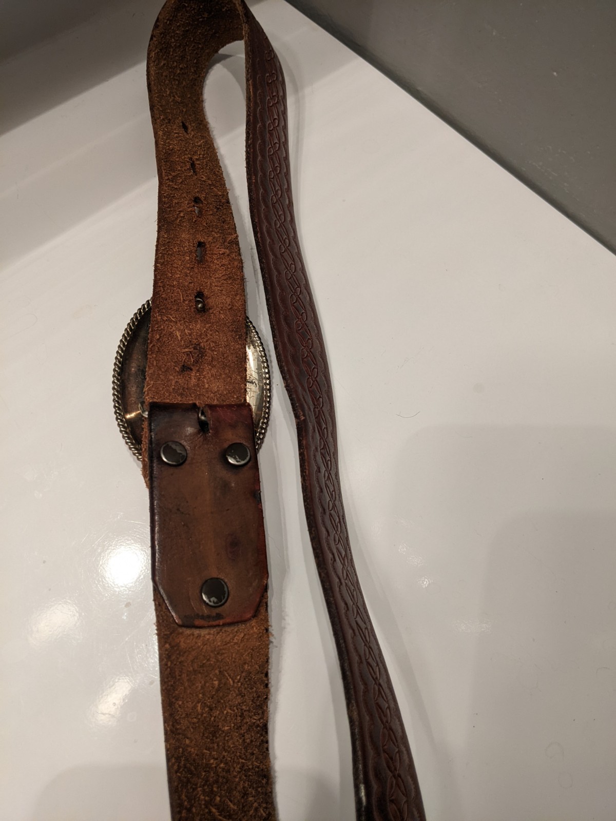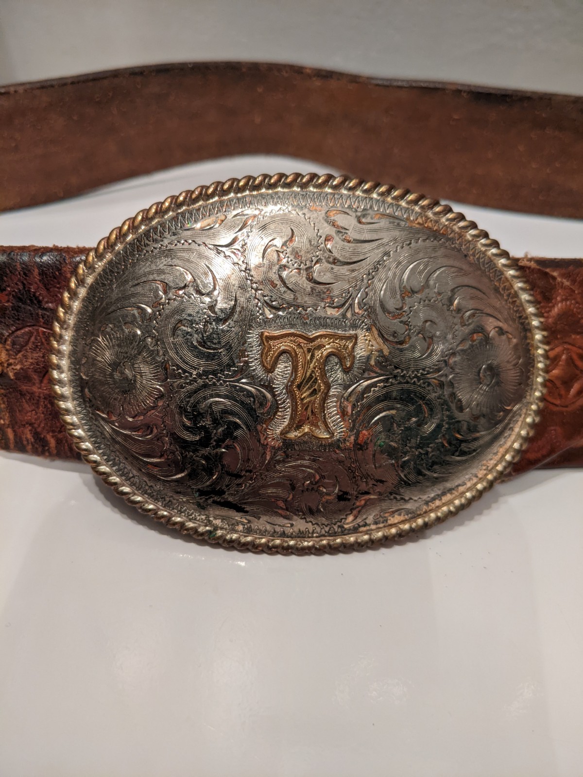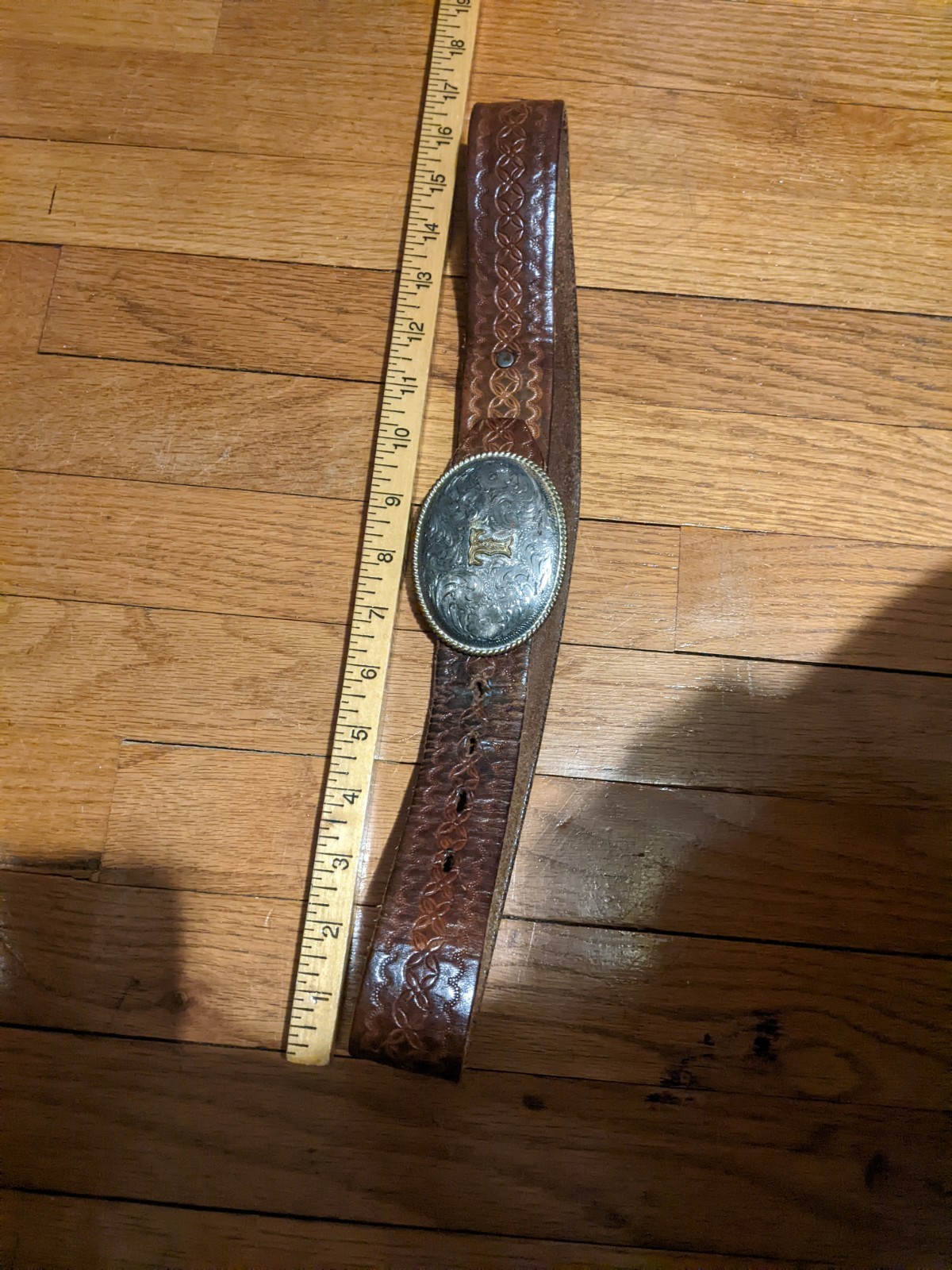 как выглядит Vintage Adult Brown Engraved Western Leather Belt and Belt Buckle "T" 35 inches фото