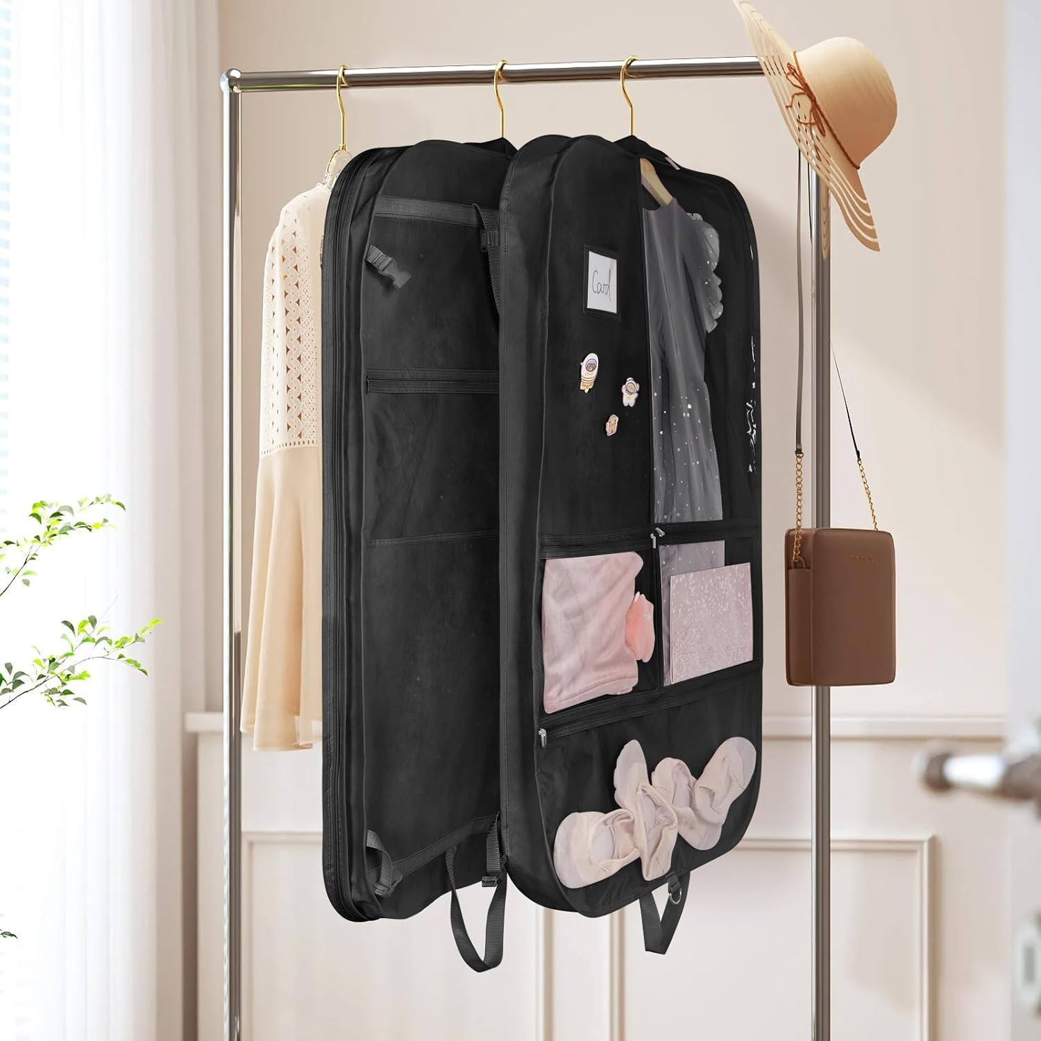 40-Inch Black Dance Costume Garment Bag with Clear Pockets and Accessories