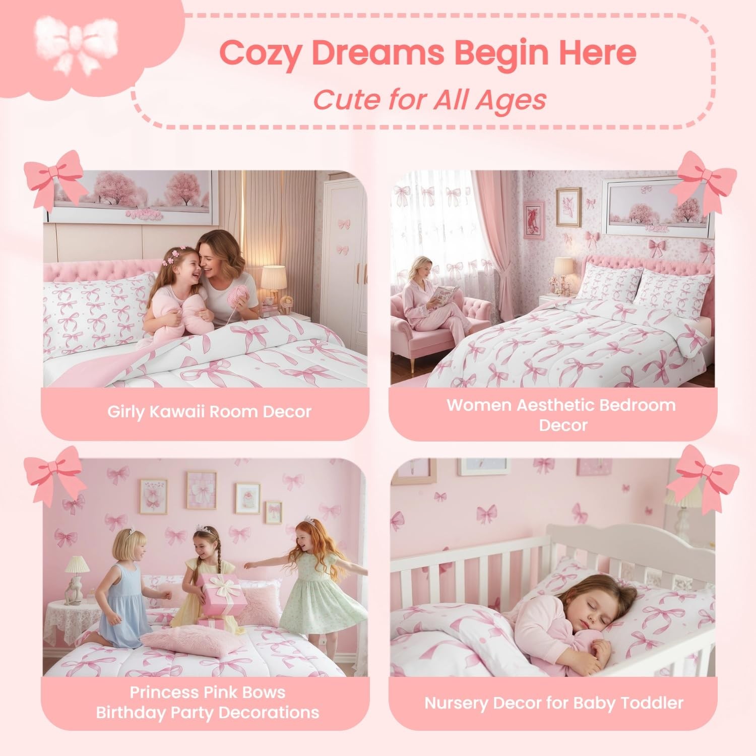 Cute Pink Bow Toddler Bedding Set for Girls,Ribbon Bow Knot Bedding Set for K...