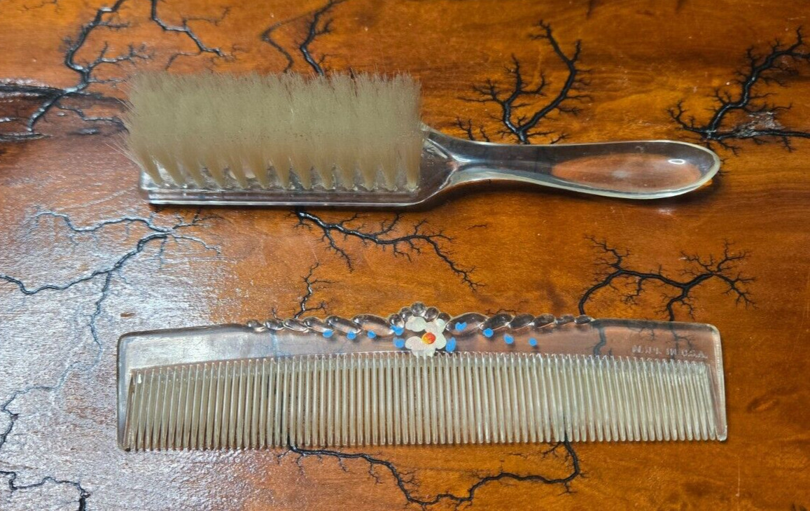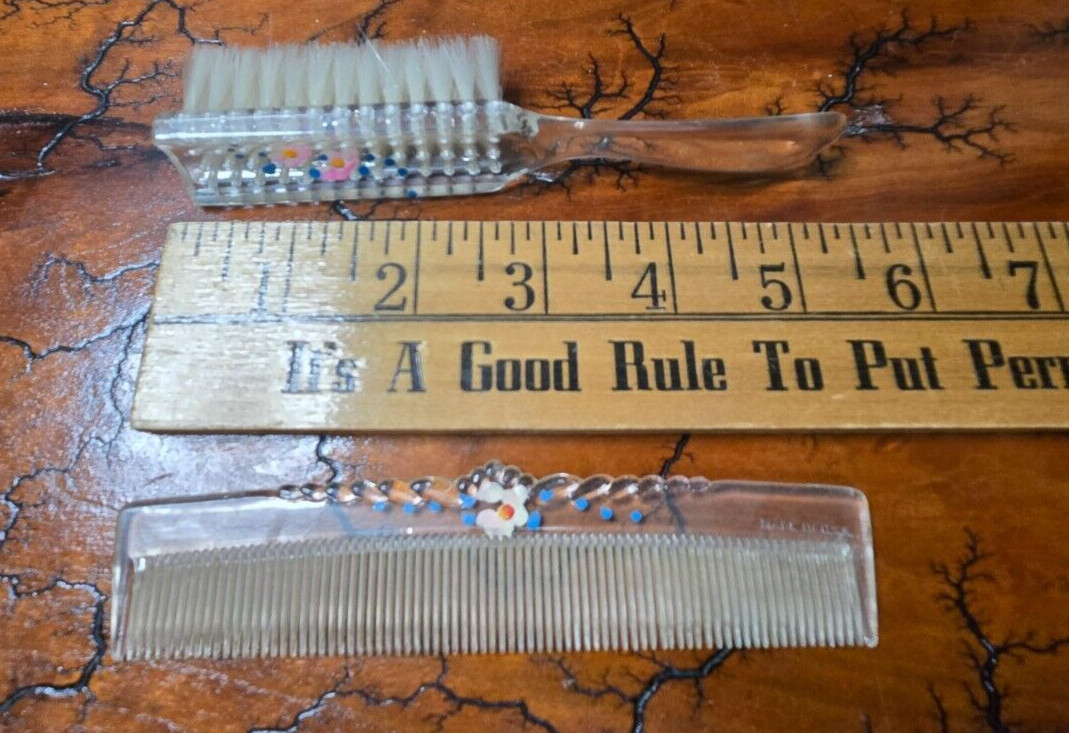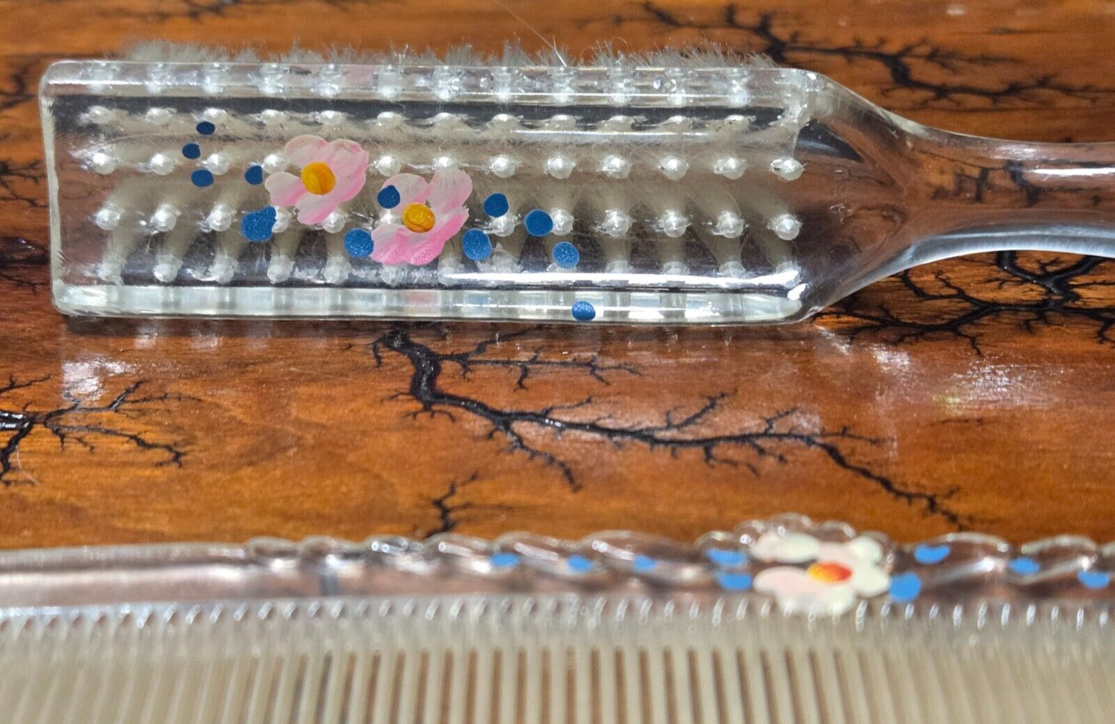 • Vtg 1950s DuPont Baby Brush Comb Set Clear Acrylic Lucite Hand Painted Flowers