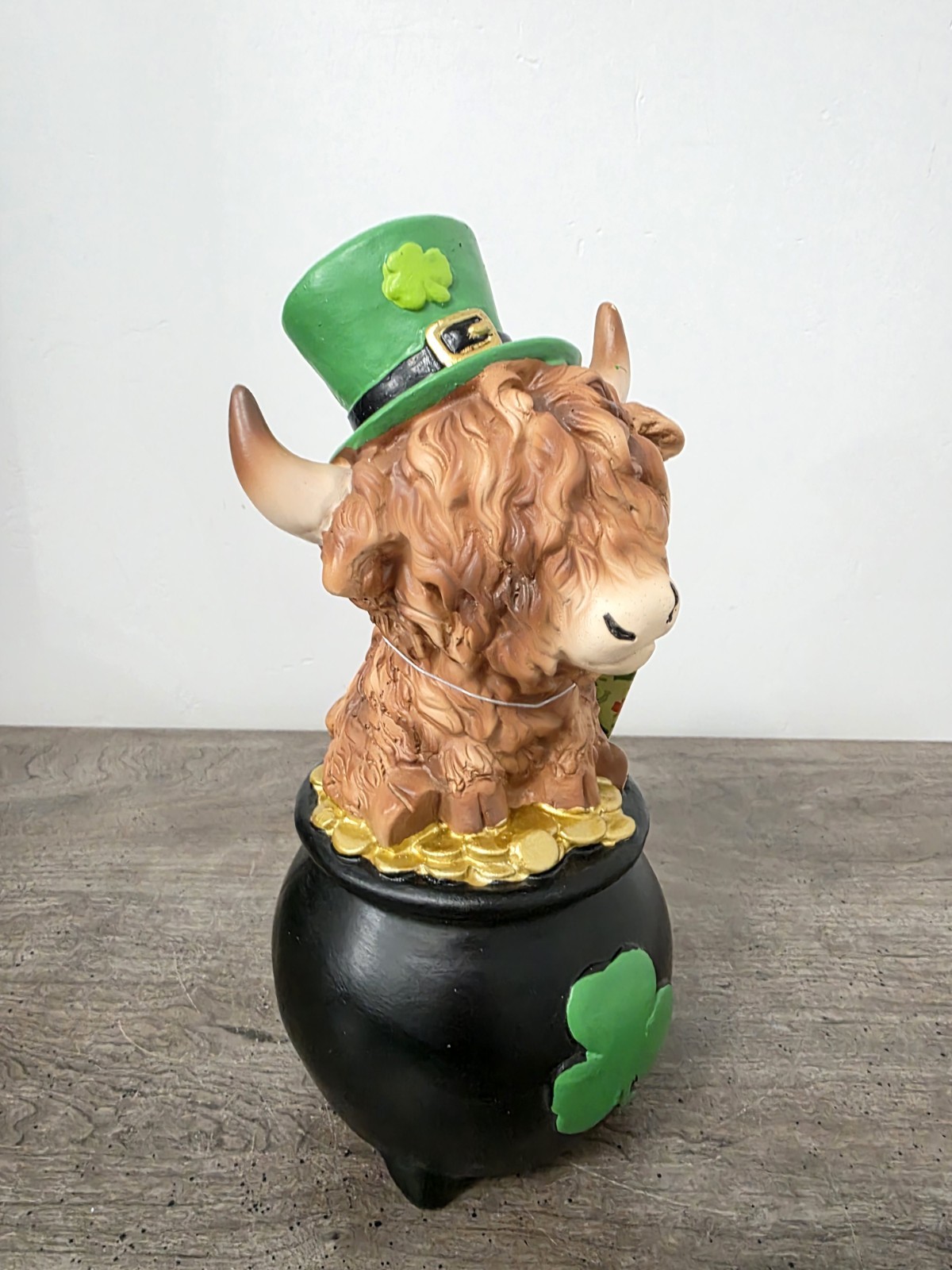 • St Patricks day Highland Cow Sitting on Pot of Gold Decor