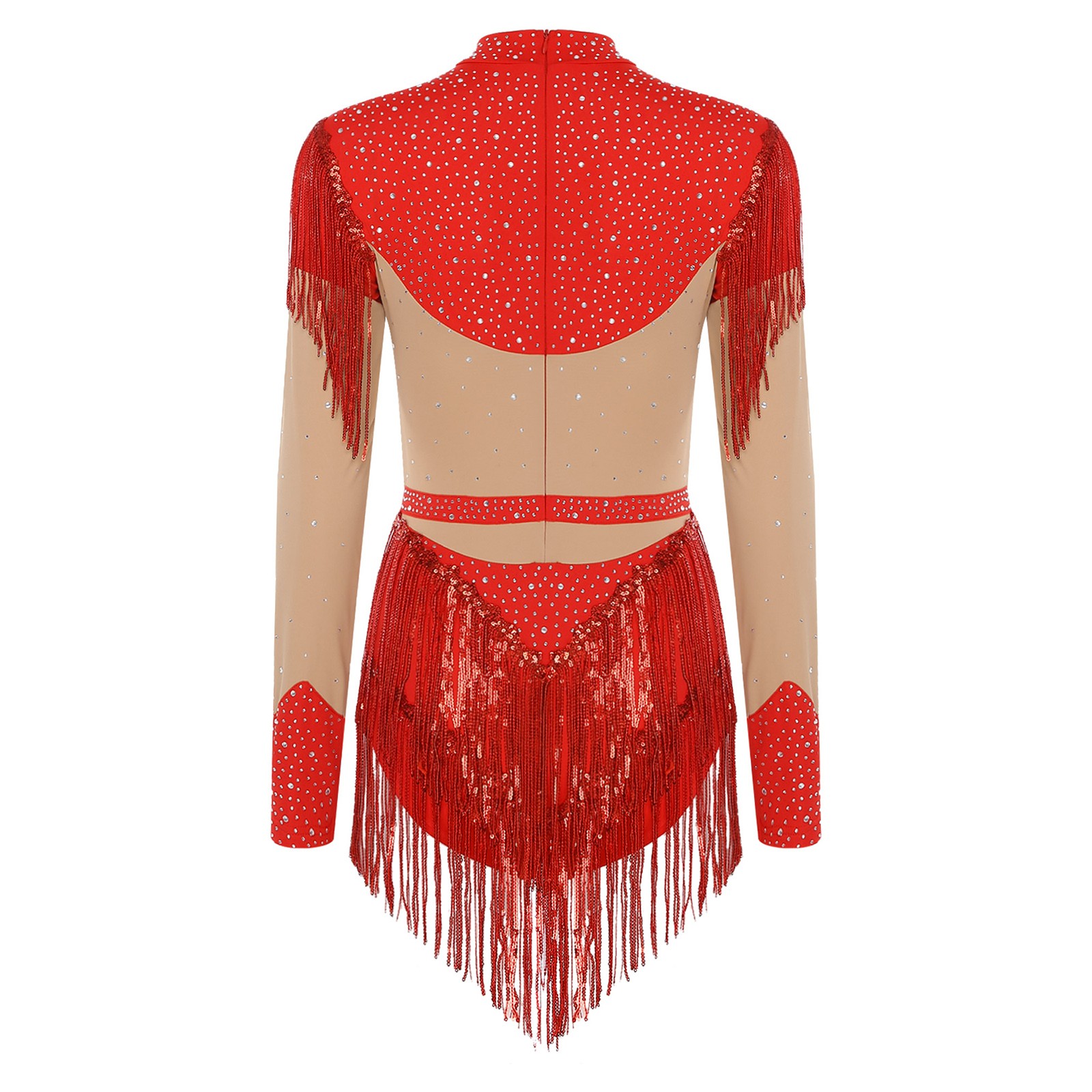 Womens Ballet Dance Leotard Dress Fringe Long Sleeves Figure Ice Skating Costume