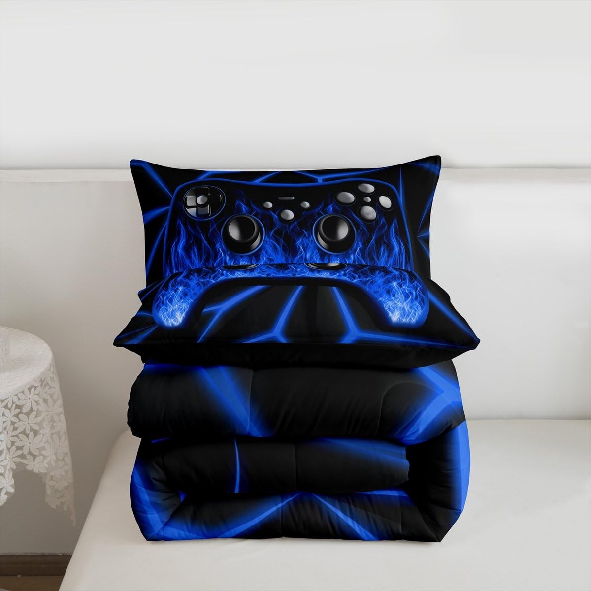 Video Game Comforter Set for Boys Twin Size, Blue and Black Gaming Bedding Se...