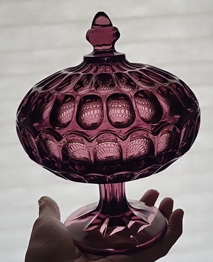 как выглядит Imperial Glass Co-Ohio Provincial Amethyst Footed Thumbprint Covered Candy Dish фото