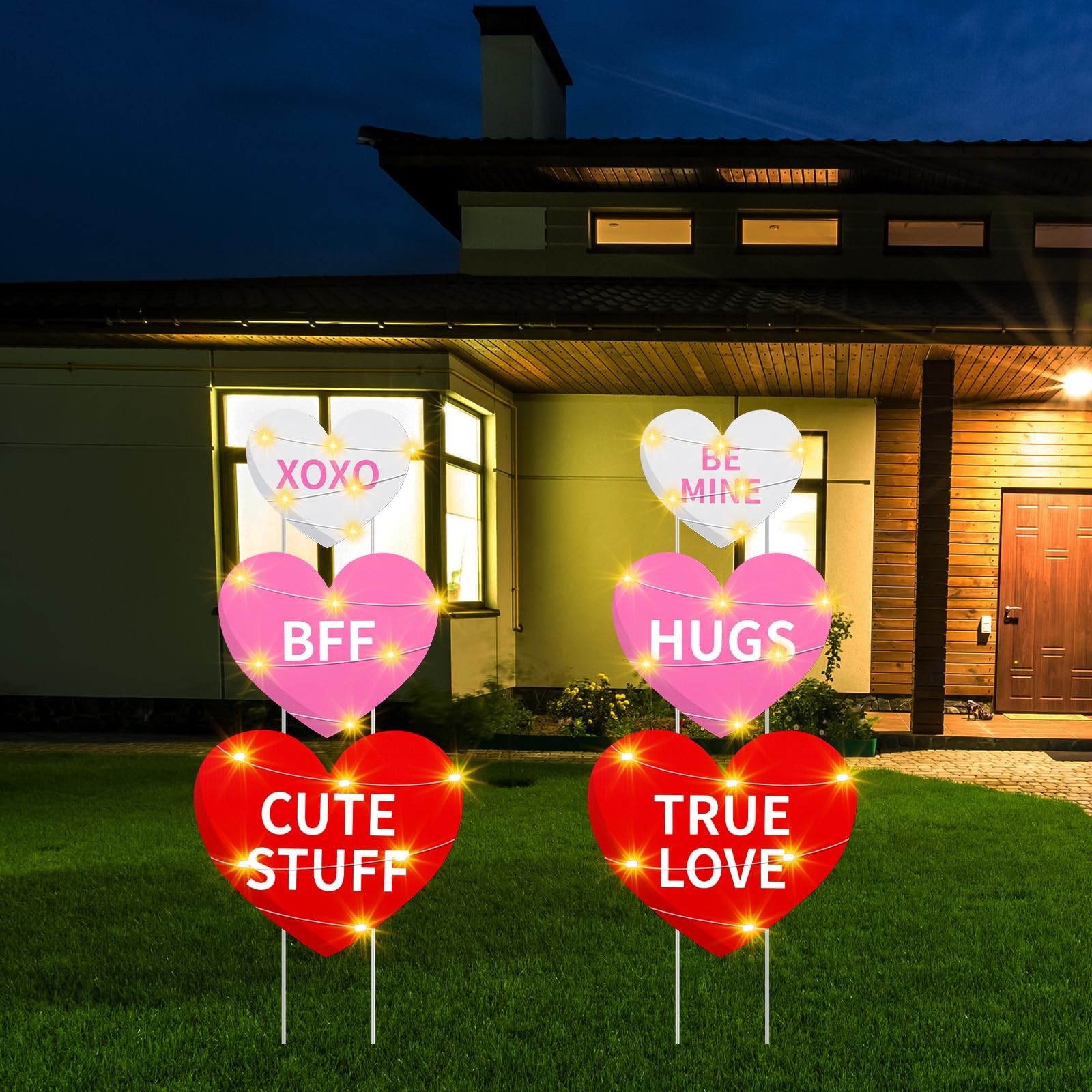6 Pcs Valentine Yard Sign with Light Heart Garden Stakes Outdoor Lawn Decor H...