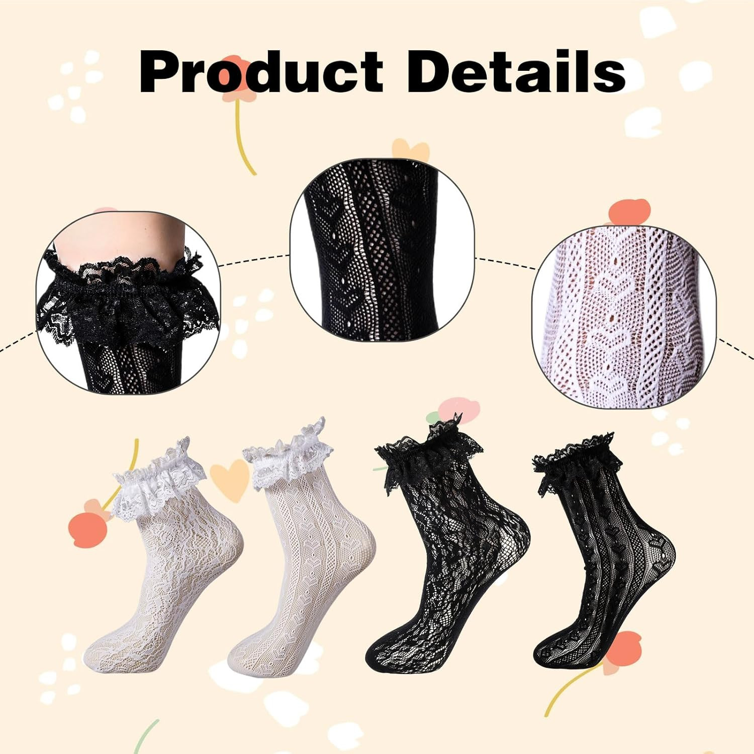 4 Pairs Lace Ruffle Socks Lace Socks for Women Ankle Ruffle,White Black Mesh Coq