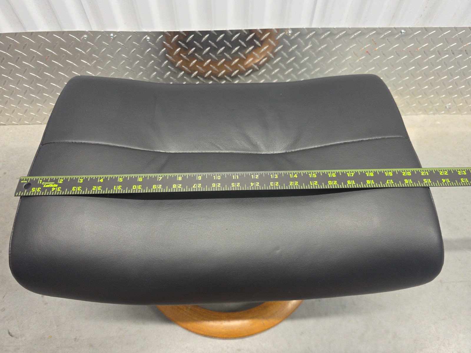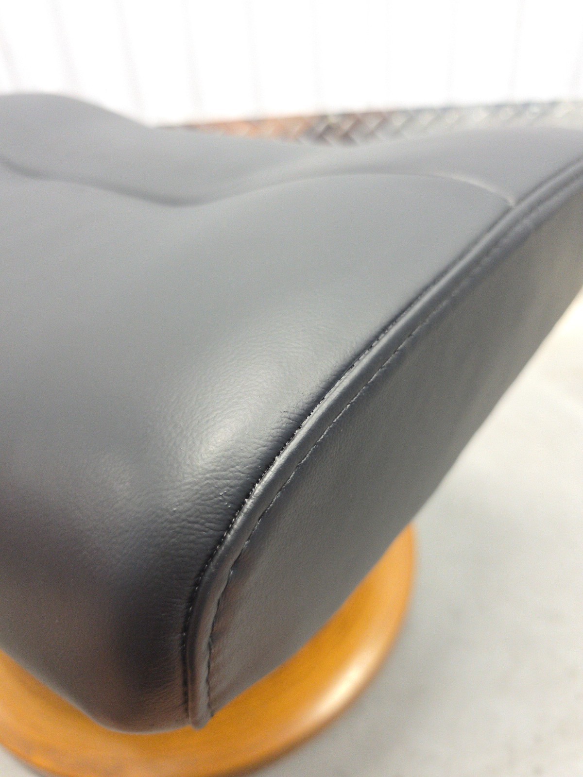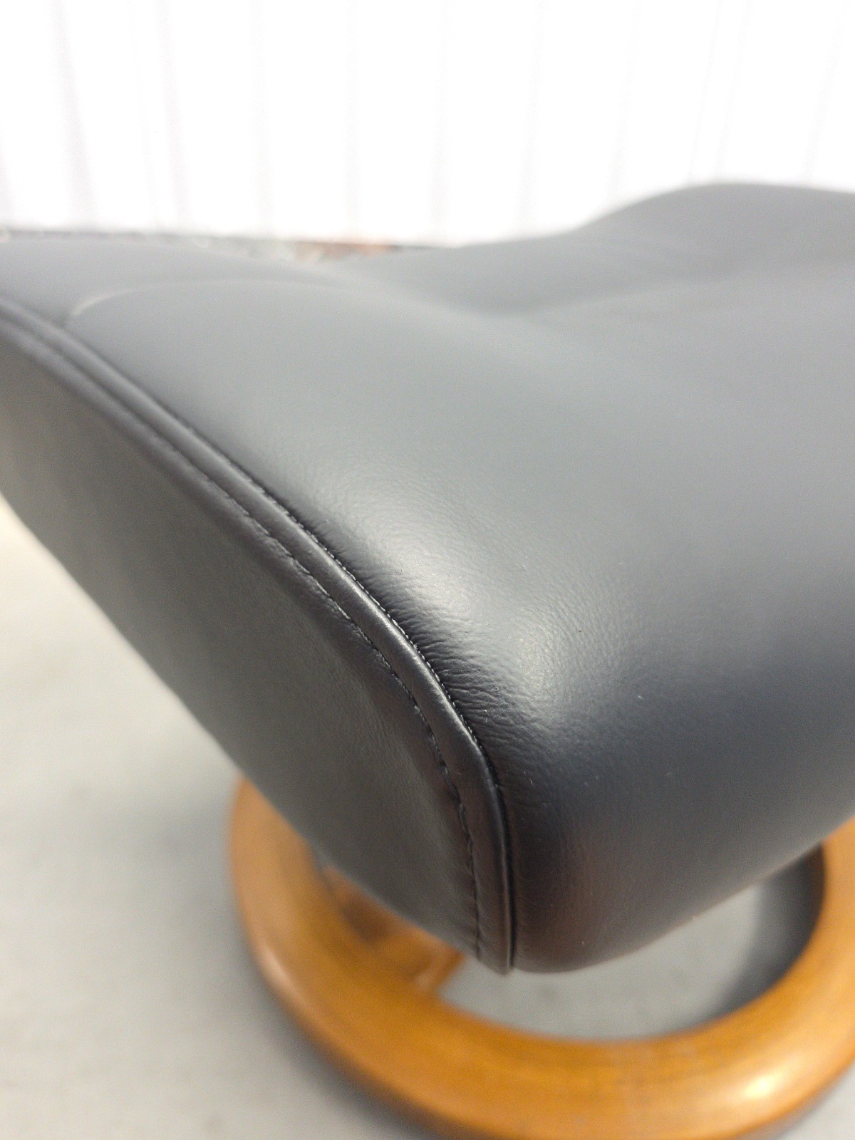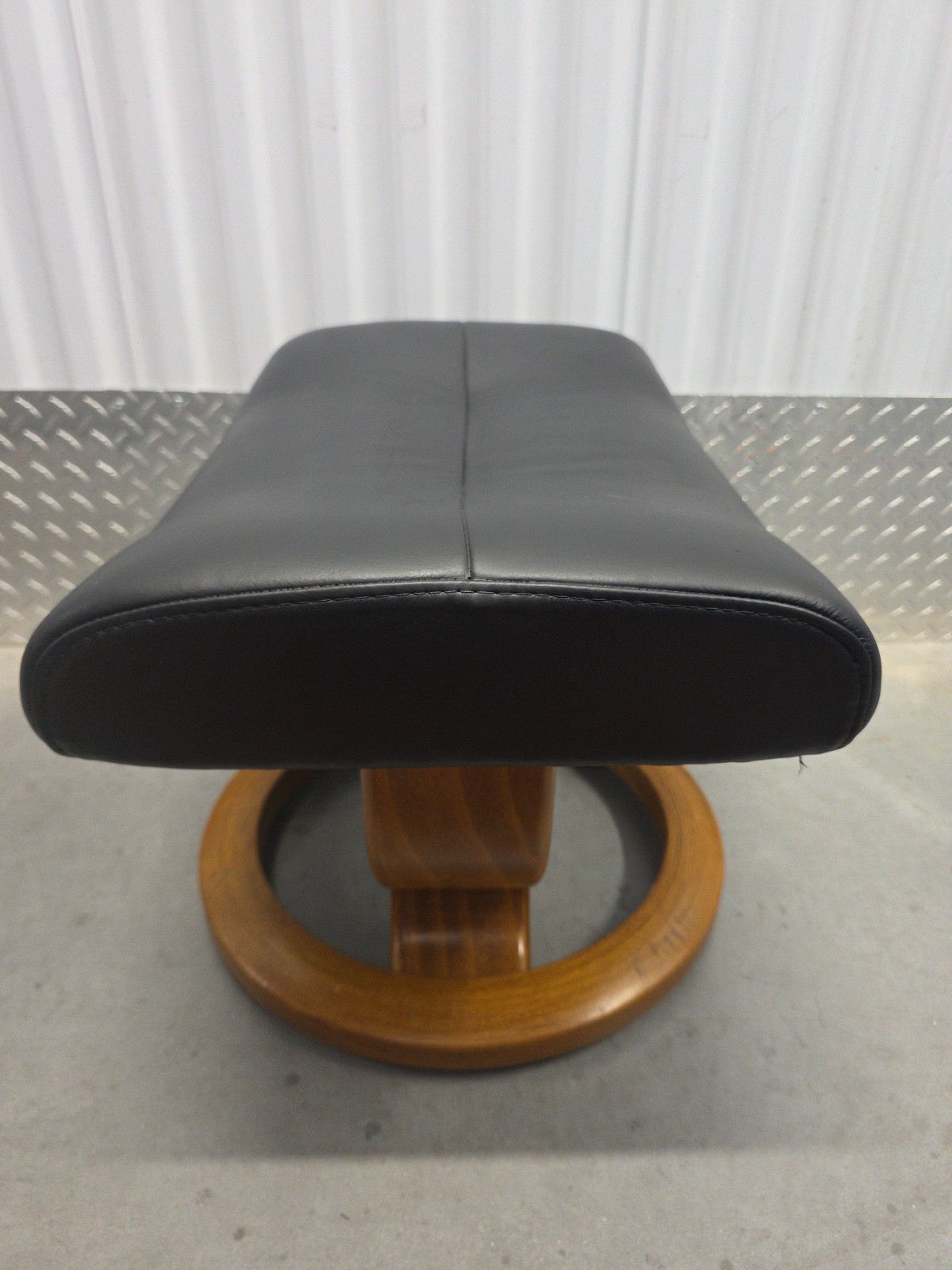 как выглядит Ekornes Stressless Black Colored Leather Ottoman Tilt Function Teak Base фото